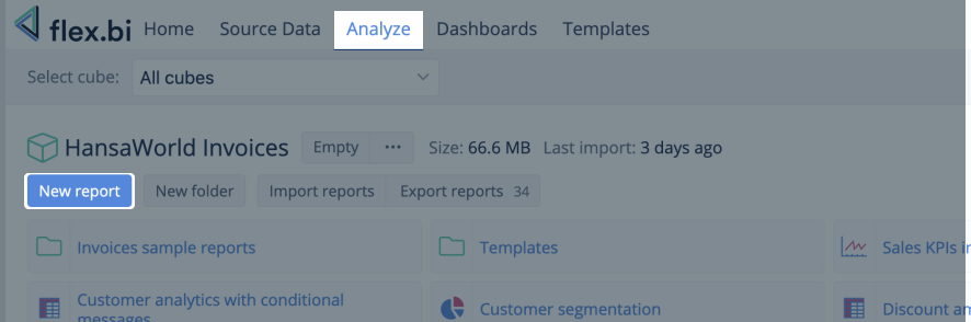After mapping and importing data, go to Analyze tab and explore data by creating New report. It would be essential to understand the report building blocks, measures, and dimensions before making flex.bi reports.