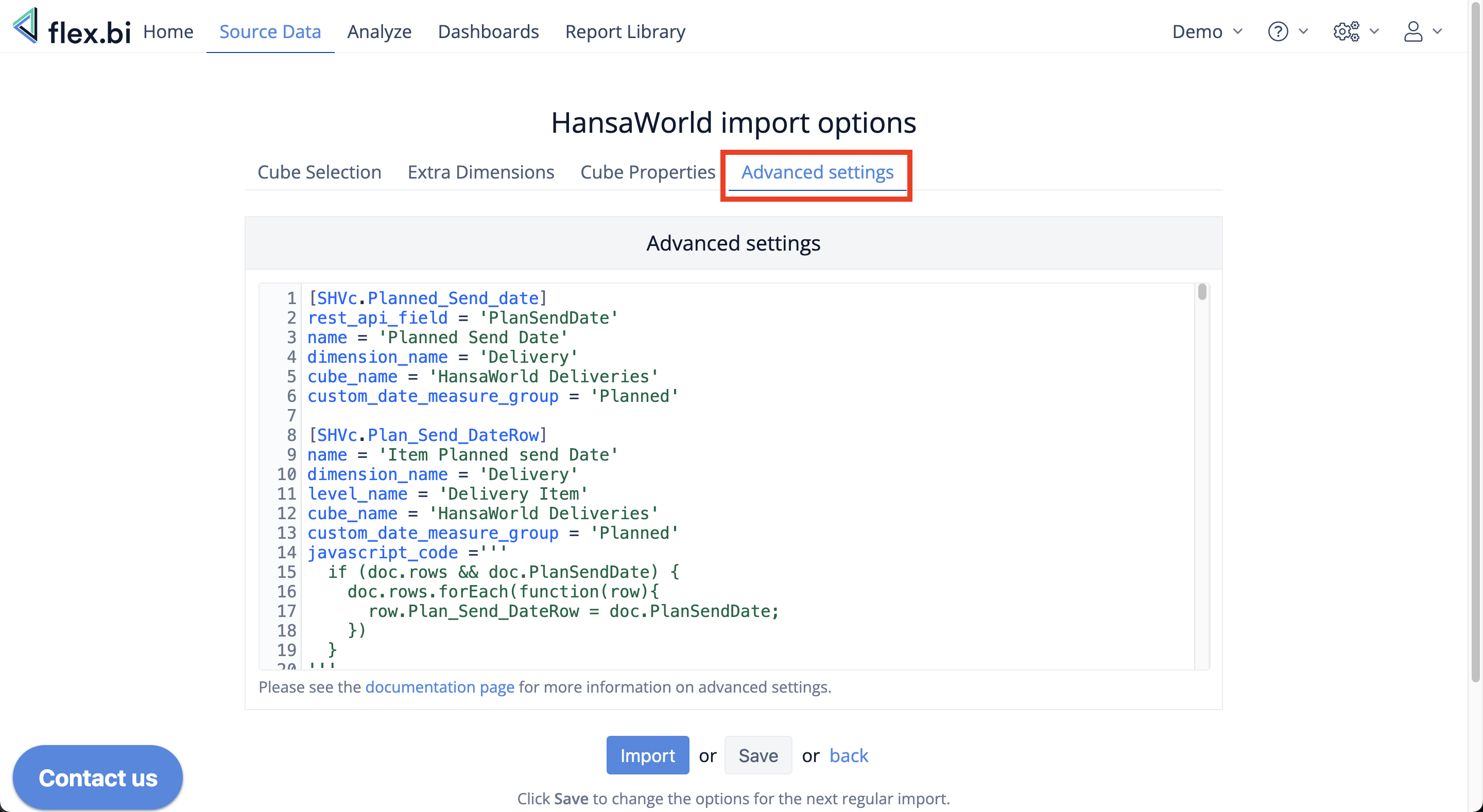 Advanced settings is a section in flex.bi applications that allow you to define custom data input for flex.bi data cubes, create new data cubes and adjust them.