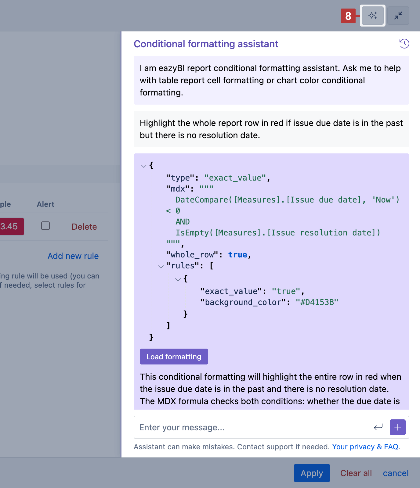 When you need assistance to apply conditional cell formatting or charts conditional formatting, use the conditional formatting assistant [8]. This assistant can suggest which methods (such as range, exact value, or custom formula) and how to apply them to highlight results. Specify coloring rules and what colors you want to use. flex.bi will generate the conditional formatting setup, including a custom formula if needed, which you load and apply to the report.
