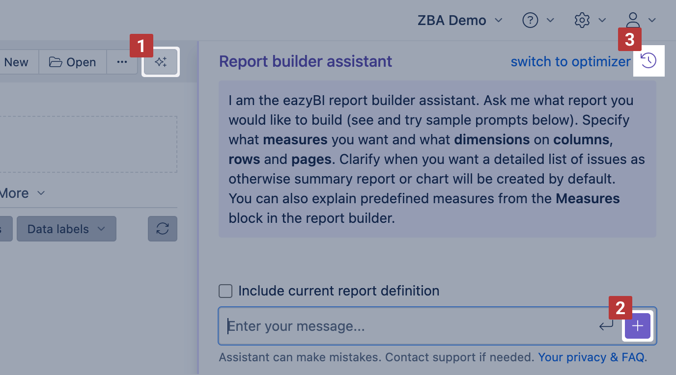 In the report view, click the AI assistant button [5] to show the assistant toolbar. From there, you can switch between Report builder assistant and Report optimizer assistant [6].