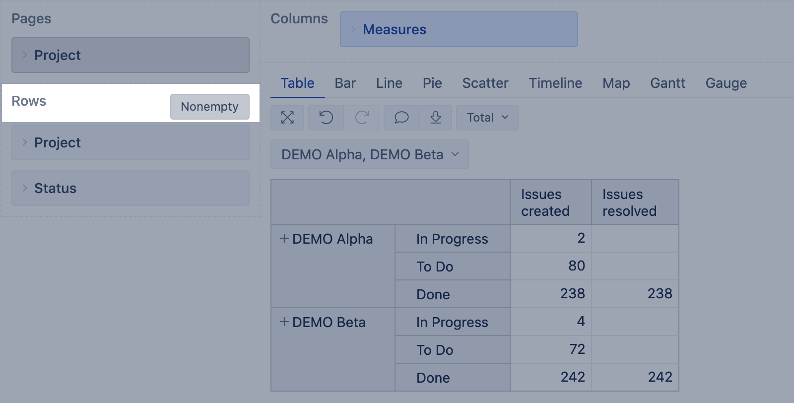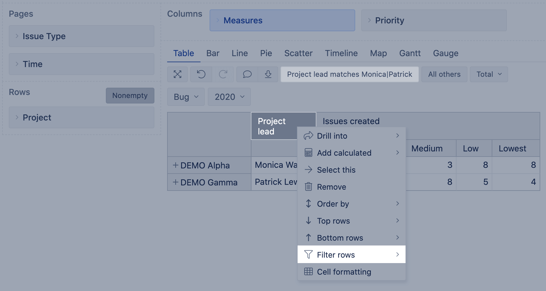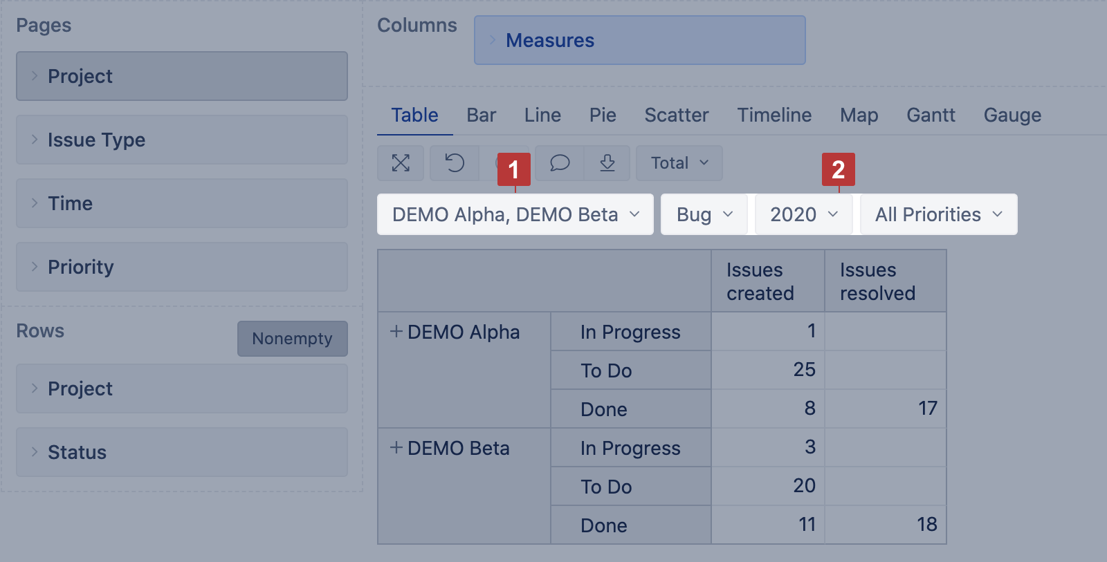 9. Filter rows by simple measures (Issues created, Issues resolved) and properties.