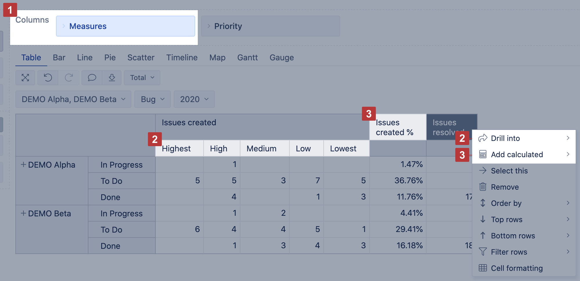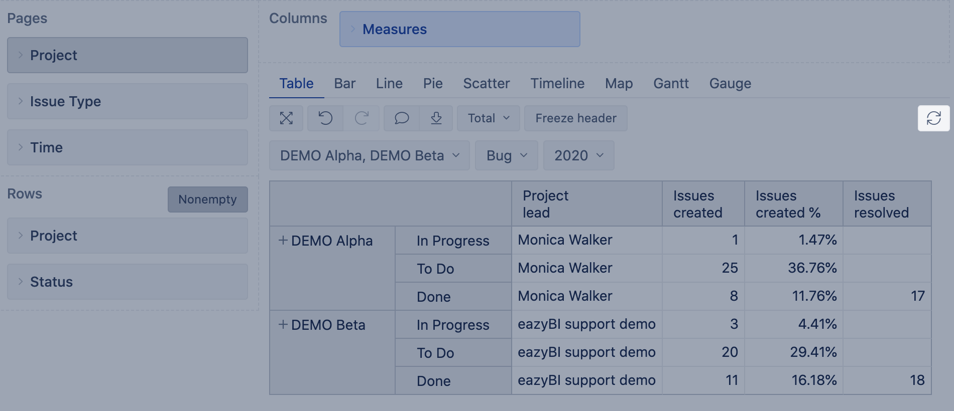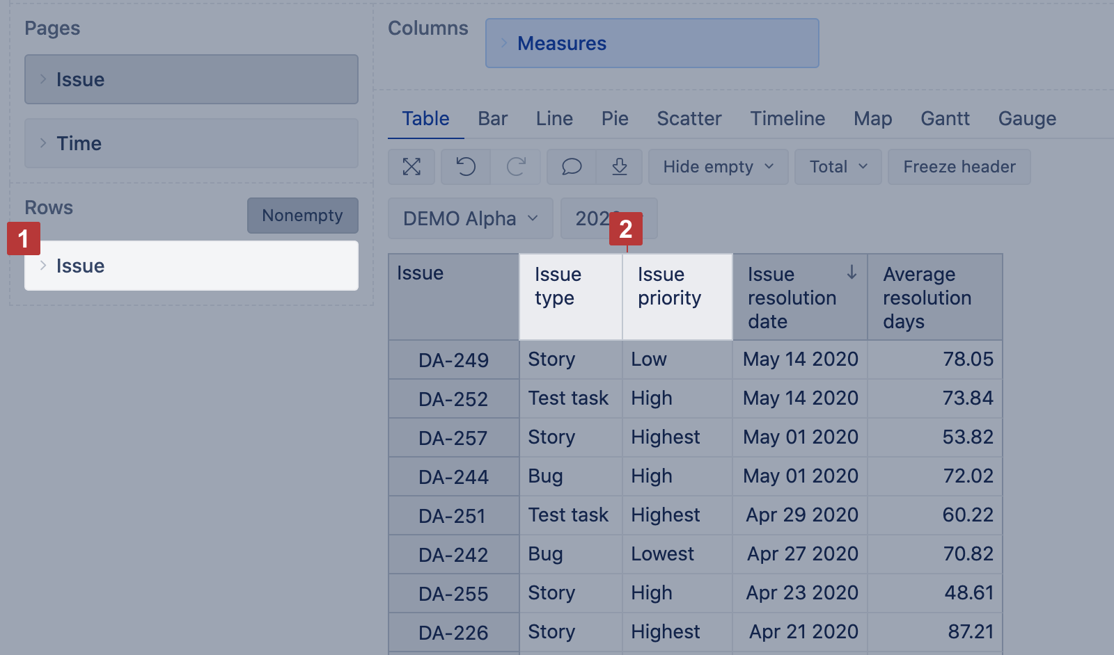 9. Filter rows by simple measures (Issues created, Issues resolved) and properties.