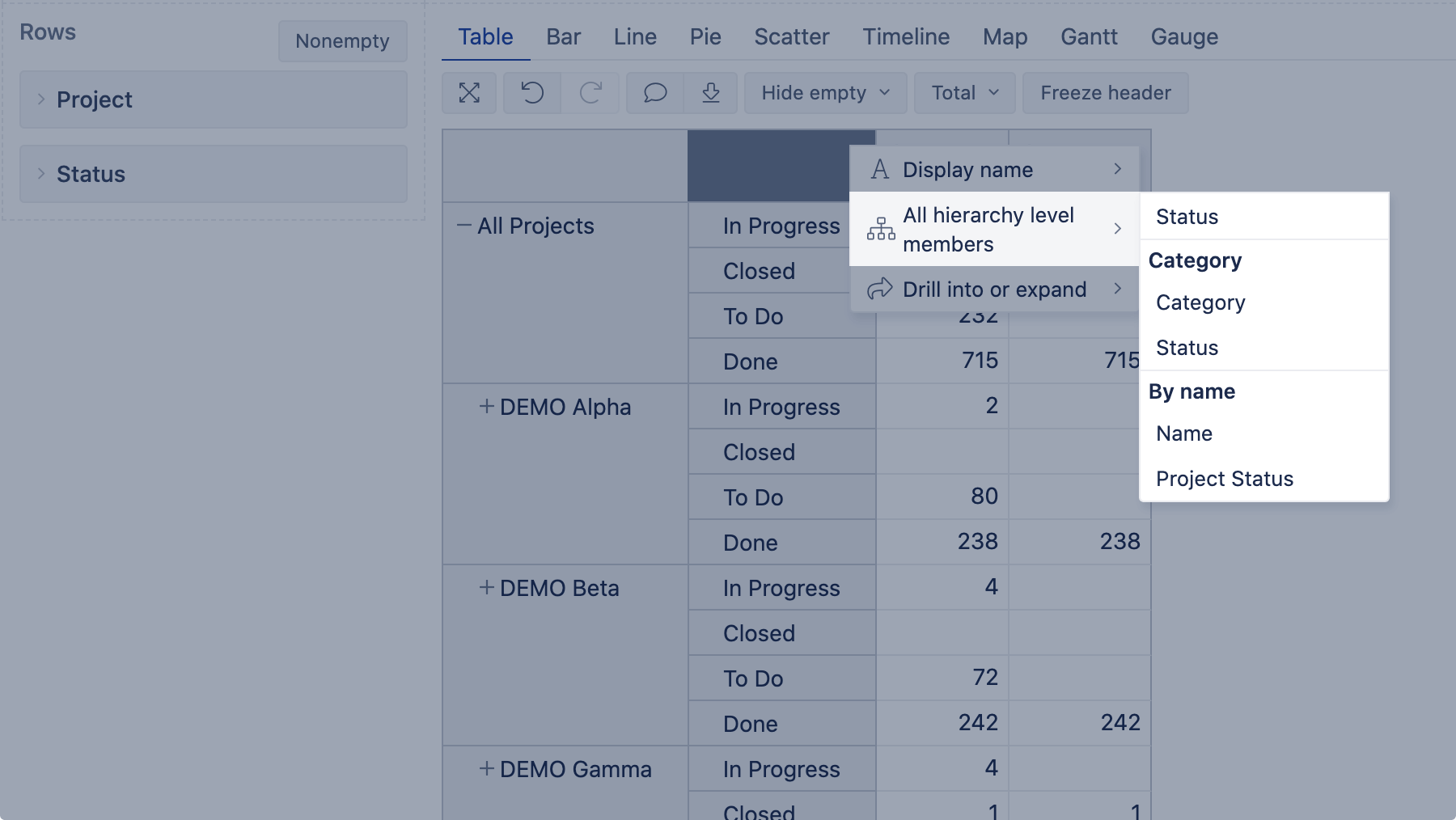 - Applying Hide empty option, to hide rows/columns without values.