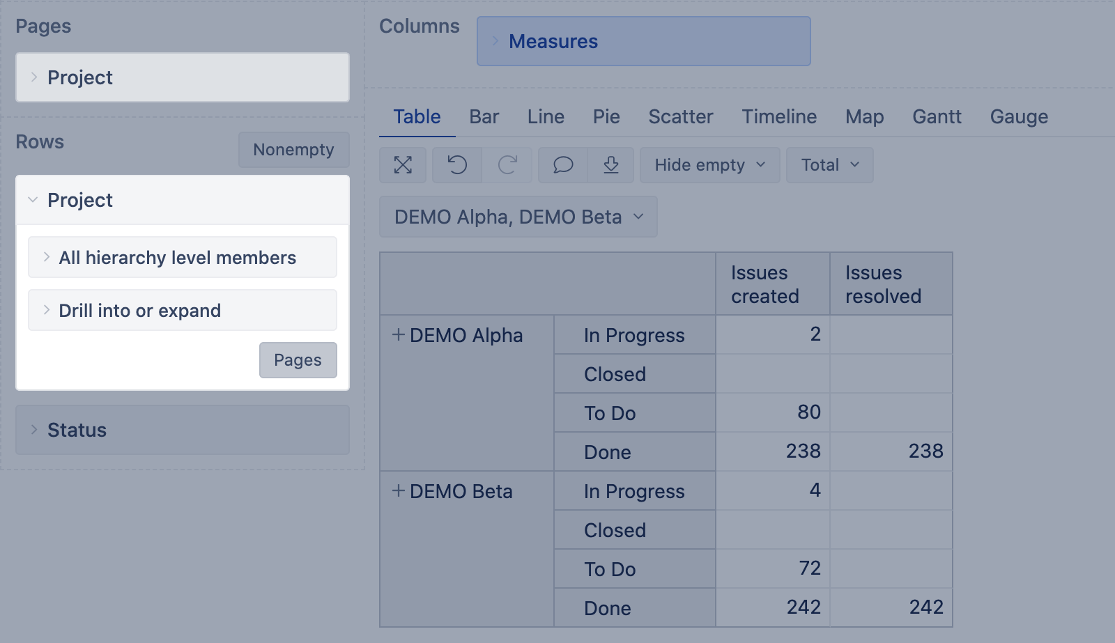 - Some dimensions contain the same data, for example, Project level in Issue, Fix version, Affects version dimensions contain all the projects as Project dimension; use, in Pages, Project level of the same dimension as in Rows instead of Project dimension