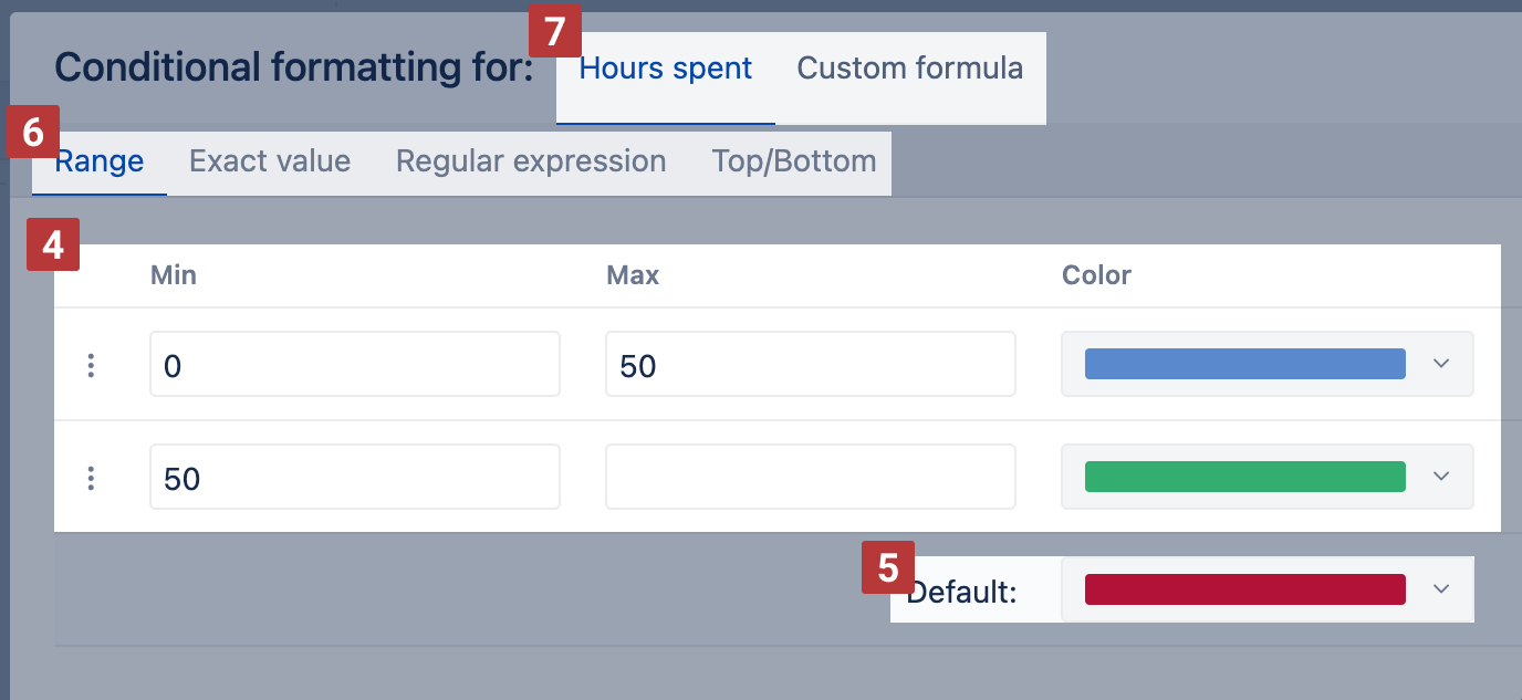 There are two ways how to apply those rules [7]: you can set them on the values displayed in the charts or on the value calculated by a custom formula. Also, there are several ways to define conditions [6]: Range, Exact value, Regular expression, and Top/Bottom. Select one of them.