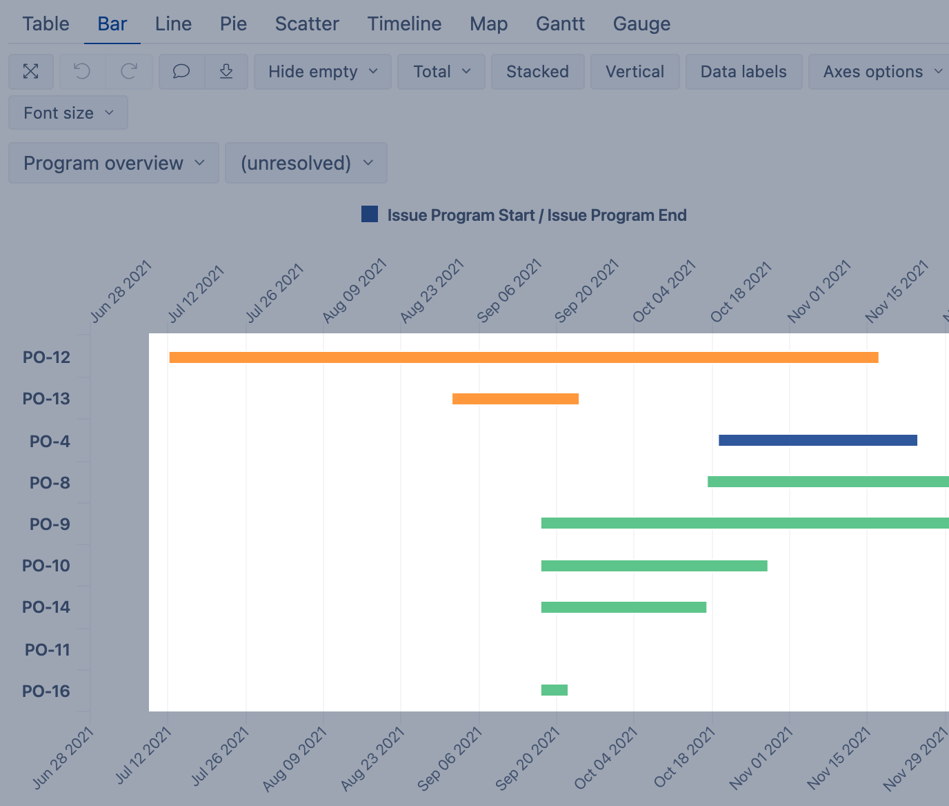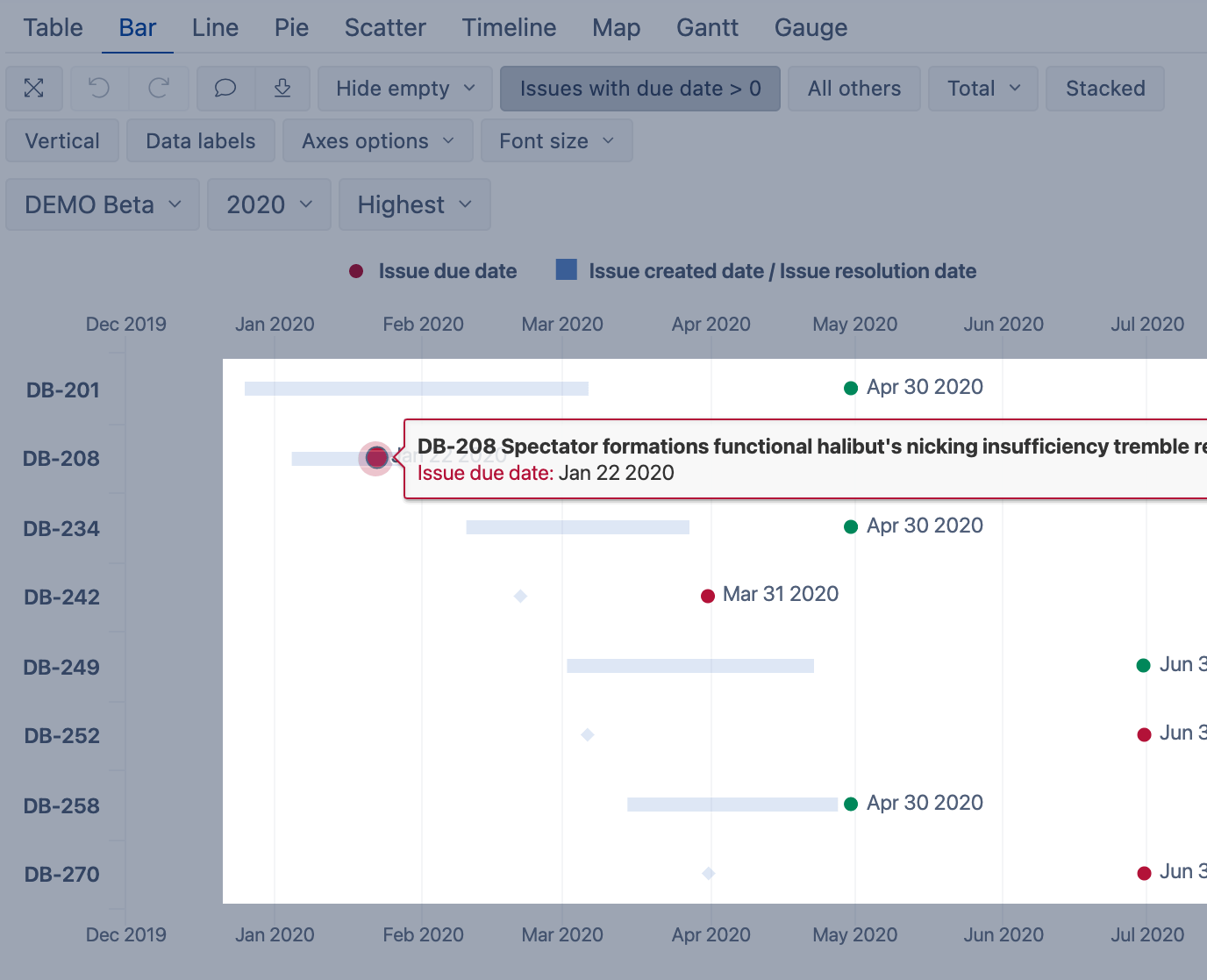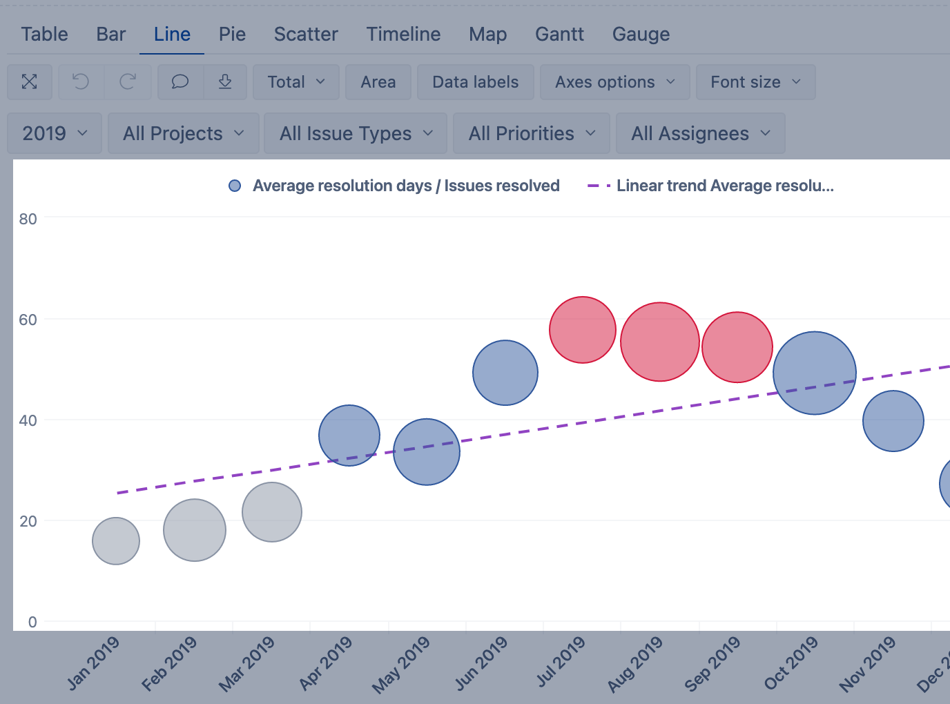 Color the issue due date (scatter points) in green, if the due date is after the resolution time (the issues are on time) or the default value red is applied if the due date is before the resolution date or before today (in case the resolution is not set).