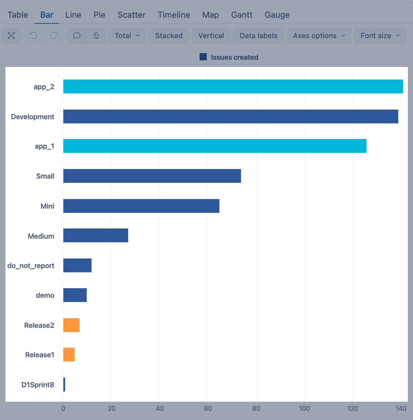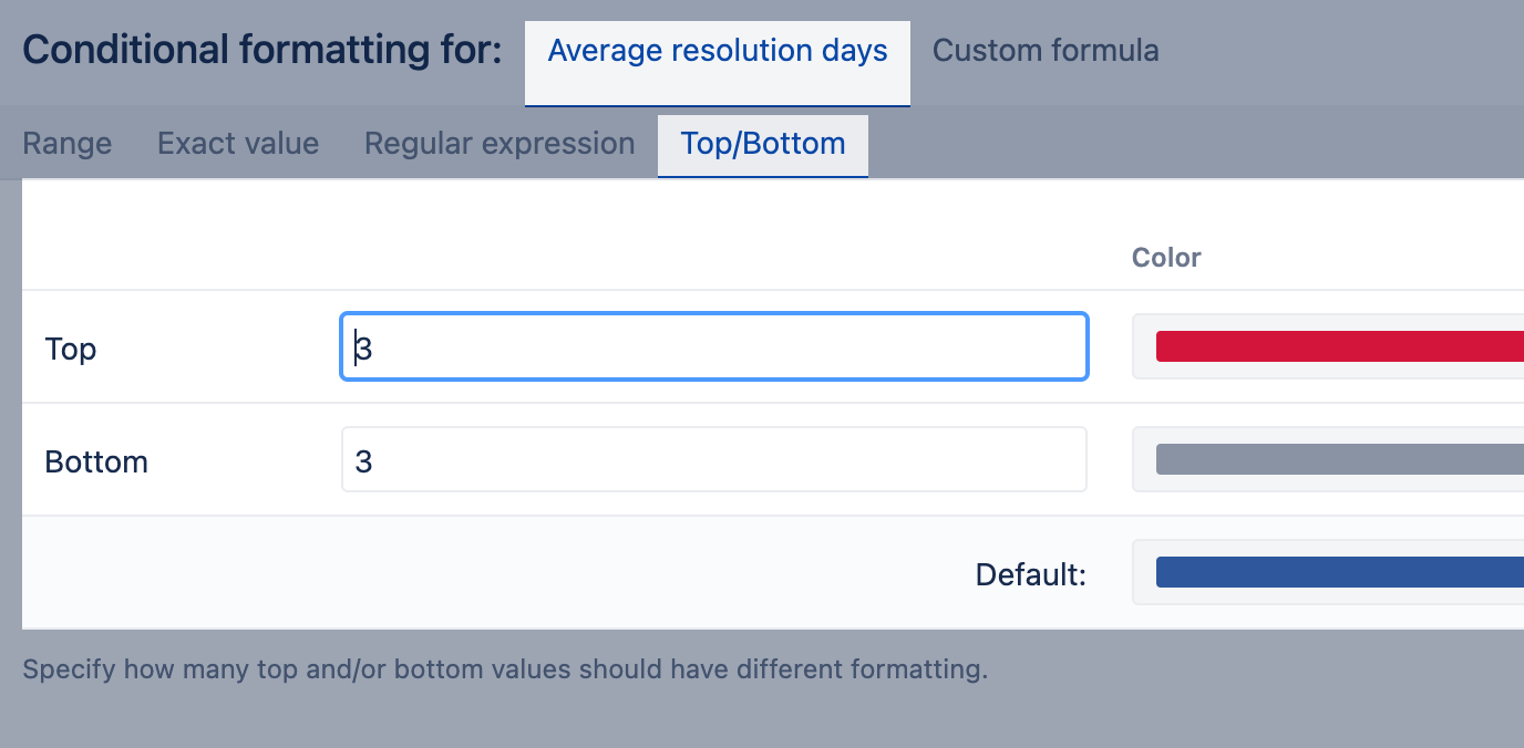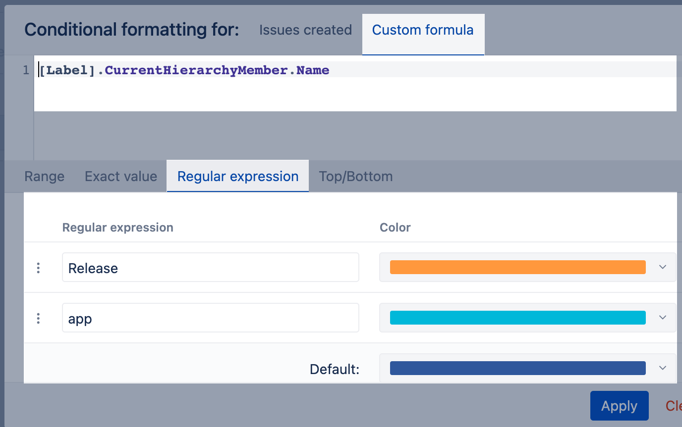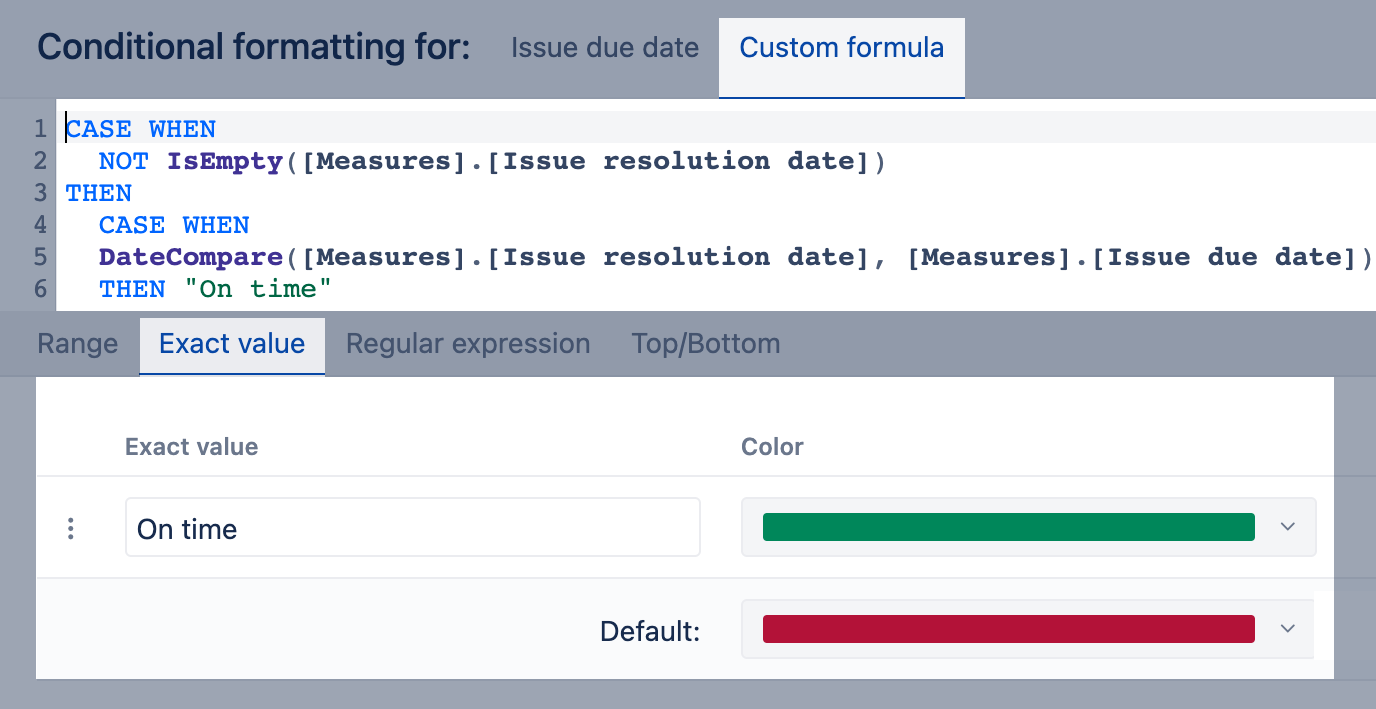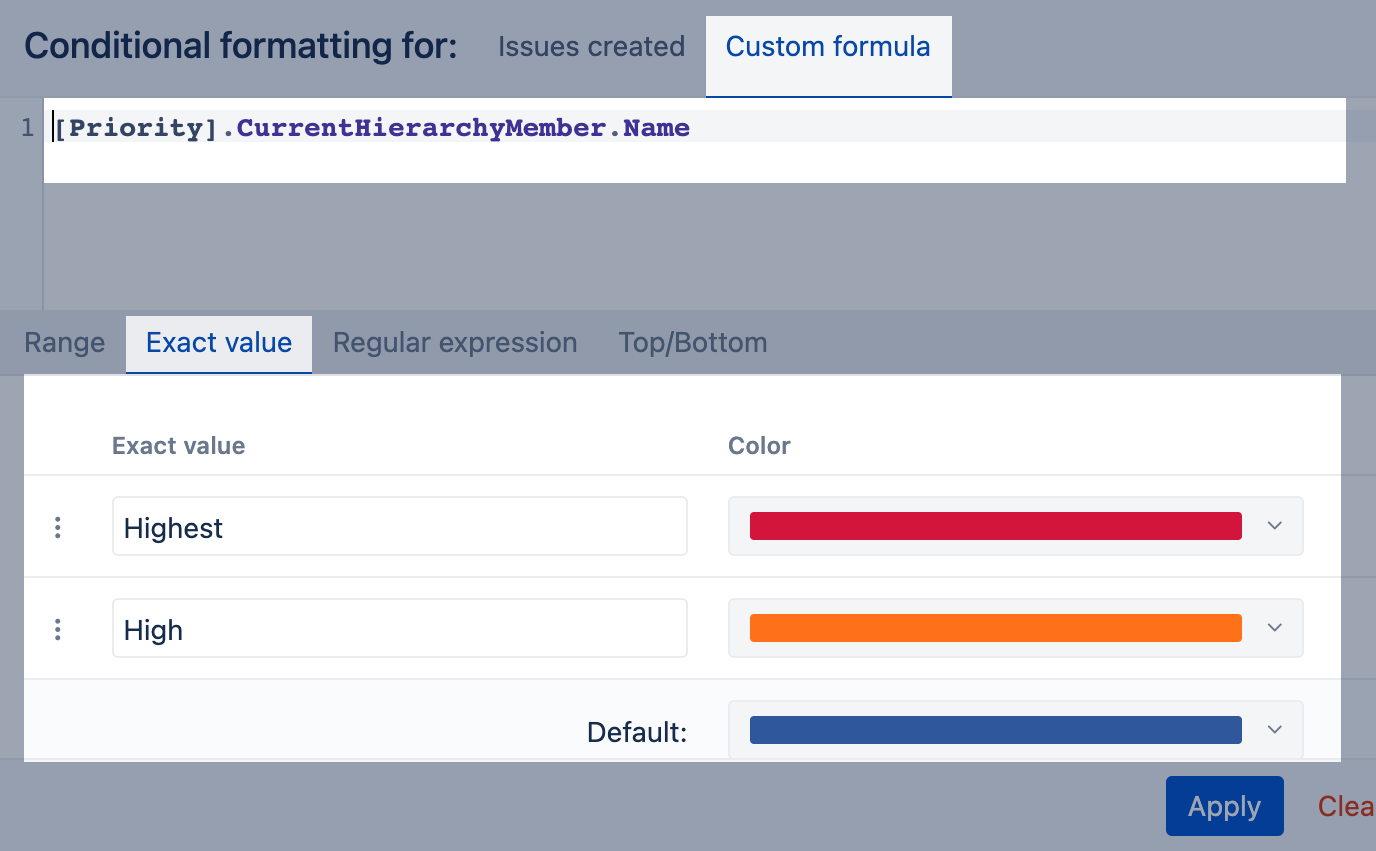 Use exact value to apply rules for text or integer values. This approach is recommended if you have a few specific or unique values (e.g., statuses for texts, story points for numbers) and you want to color-code charts by them. Use precise and case-sensitive values.