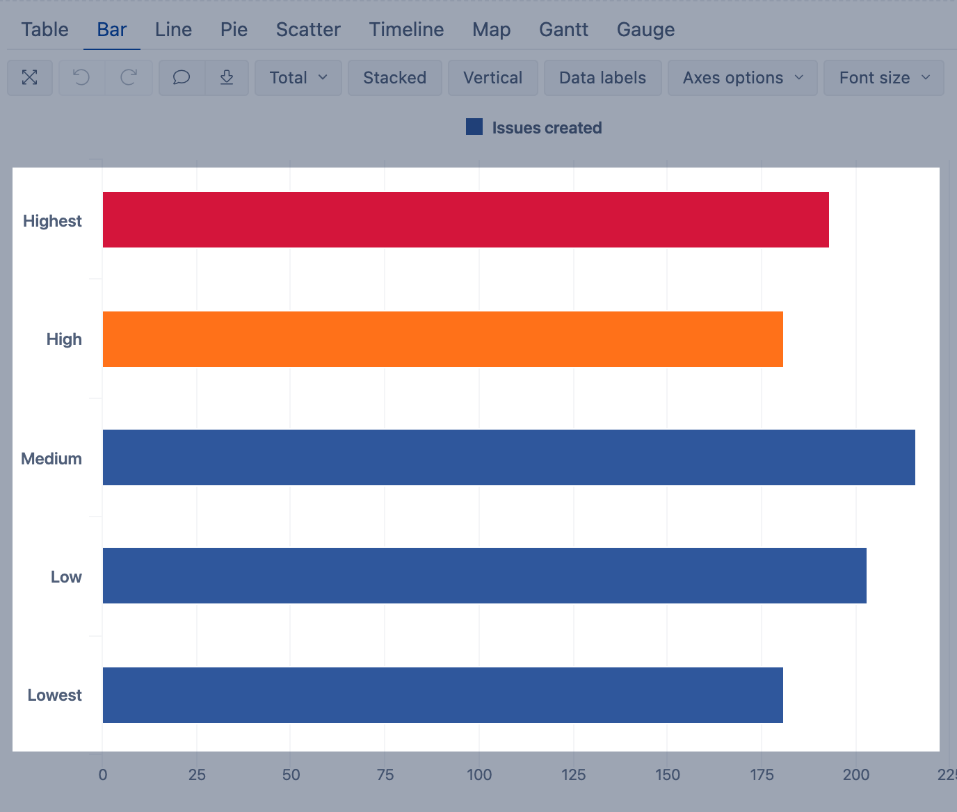 Using exact value condition together with custom formula, change bar color for priority Highest to red and High to orange.