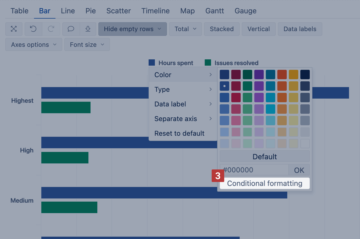 Select Conditional formatting [3] for the measure if its type is bar, scatter, range, or bubble.