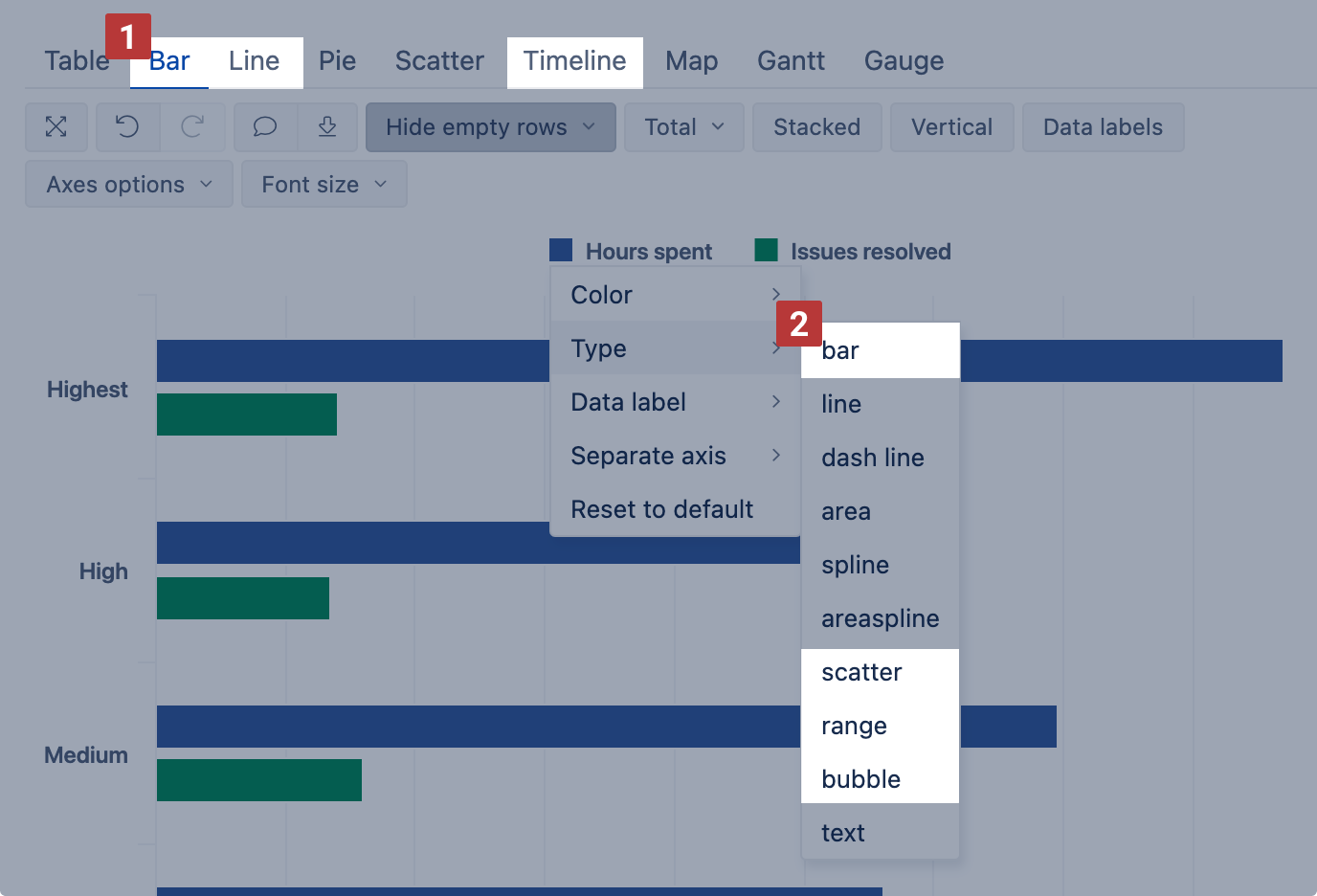 Conditional formatting is available in bar, line, and timeline [1] charts for types: bar, scatter, range, and bubble [2].