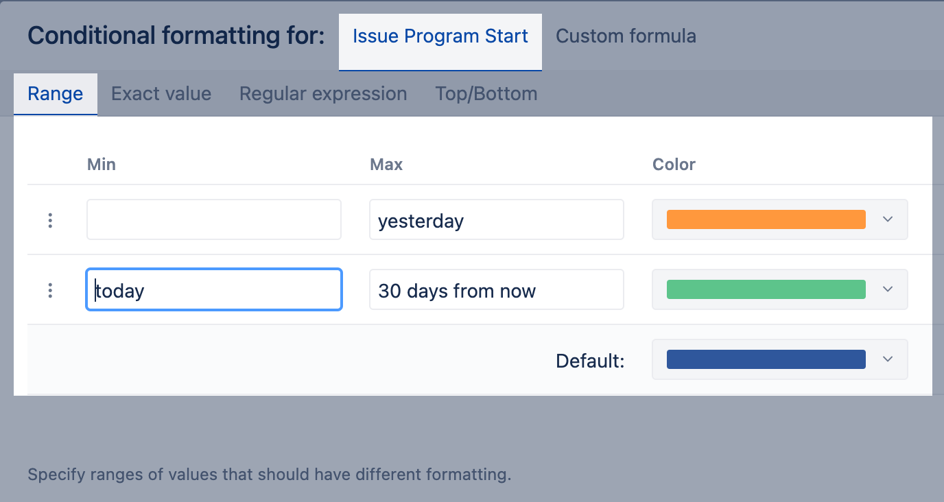 Using relative dates, color-code ranges based on issue start date: is already started, will start from today within next 30 days, and starts after 30 days in future (default color).