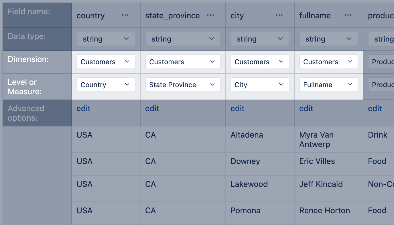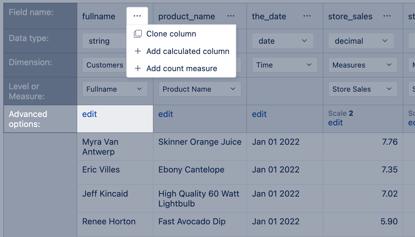 Quite often, source data are not well suited for data mapping, the format is not right for the data type, a numeric column for the measure is missing, the column order does not support the hierarchy or property creation or you would like to add some logic based on the available fields. In those cases you might want to adjust the source data by reordering or cloning columns, adding the count measure, adjusting column values with JavaScript, or creating new calculated columns based on source data.