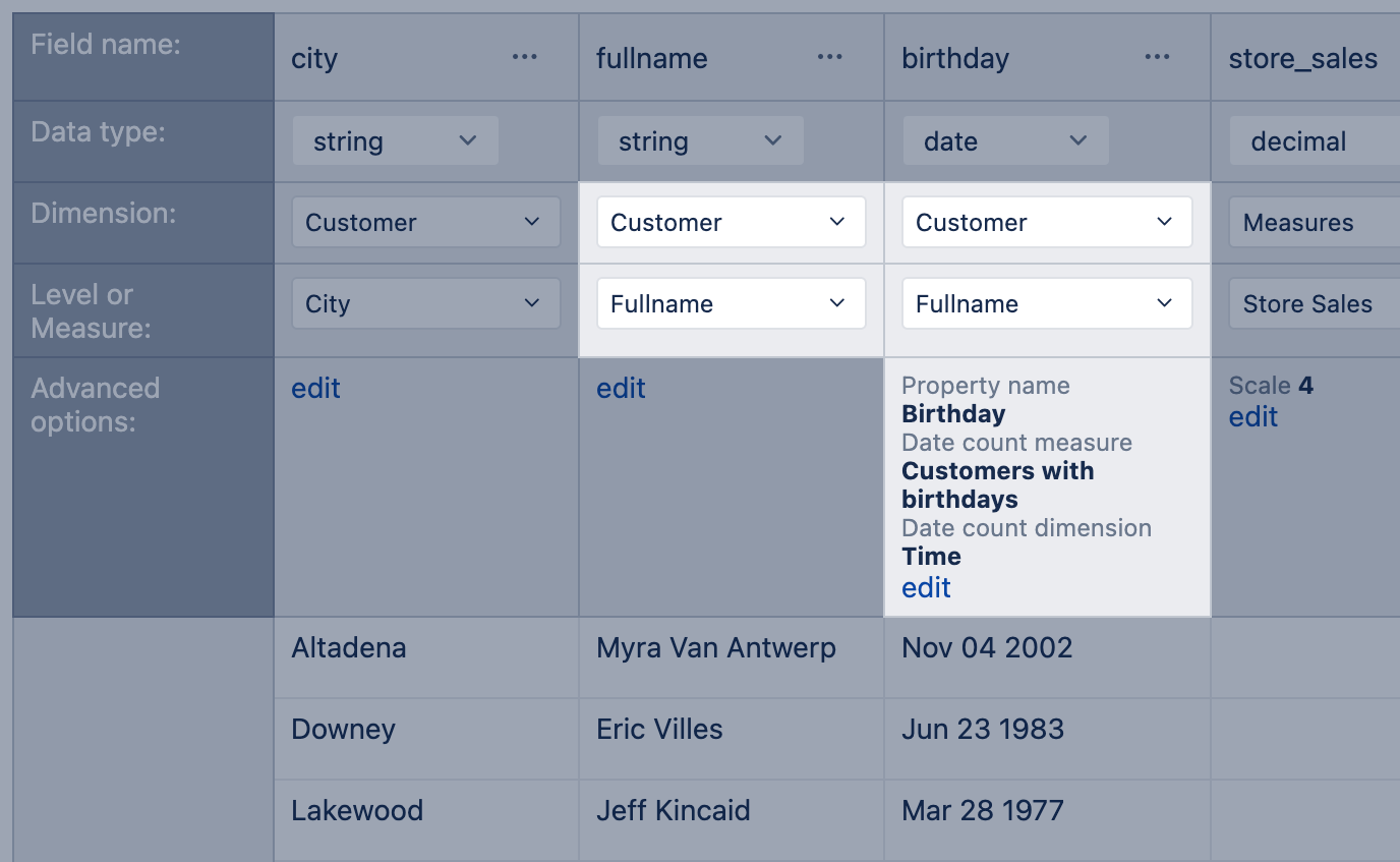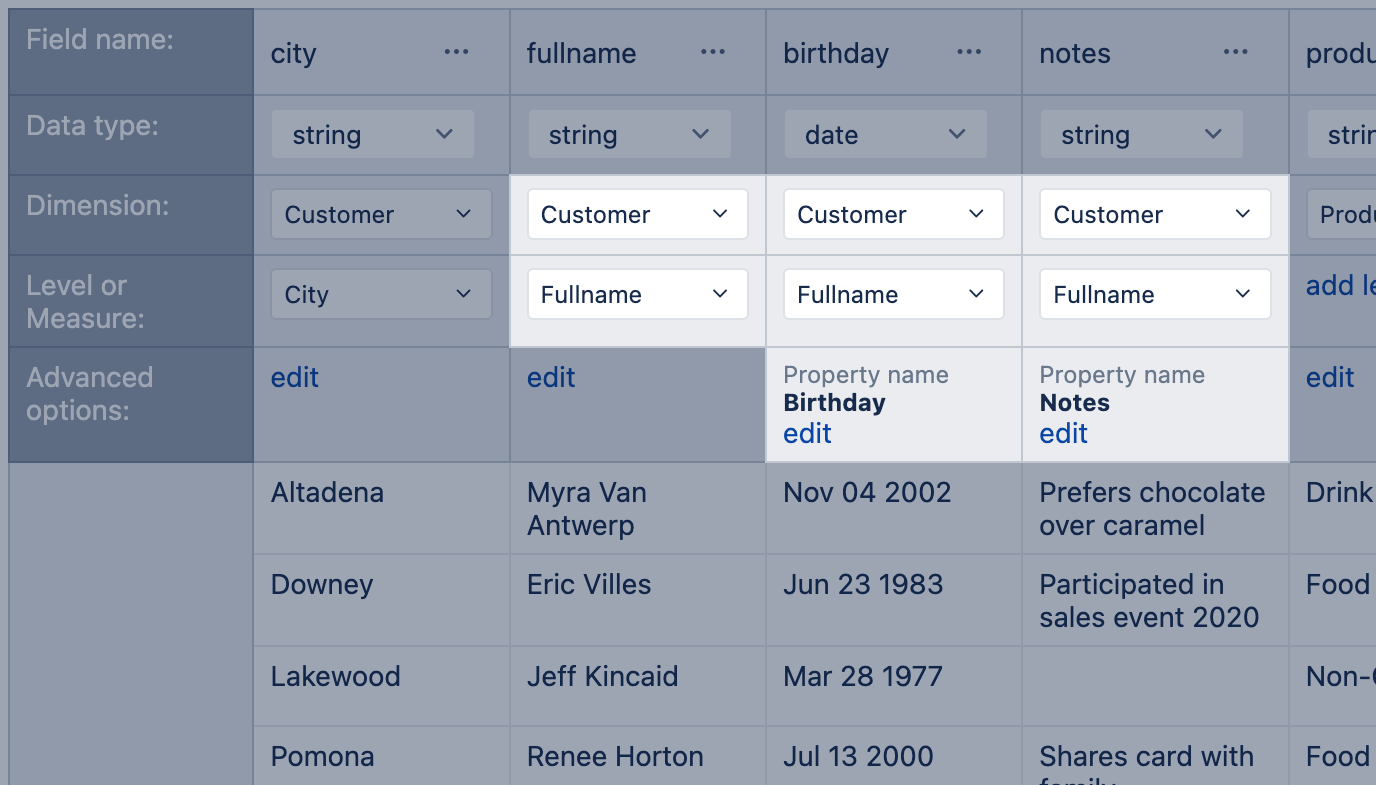 - Specify the property name in the Advanced options. In the report, the property will have a prefix with a dimension name for grouping data and improved searchability. In the example below is mapped new property "Birthday" to dimension "Customer"; in the report, you will find this field by name "Customer birthday".