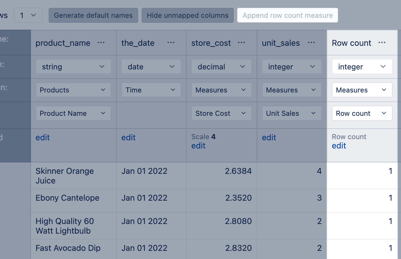 If you do not have any numeric value in your data source, you can tell flex.bi to generate it for this data cube. Chose Append row count measure to add a new column containing the number 1 for each row. Update the name for a row count measure so it would represent the file content.