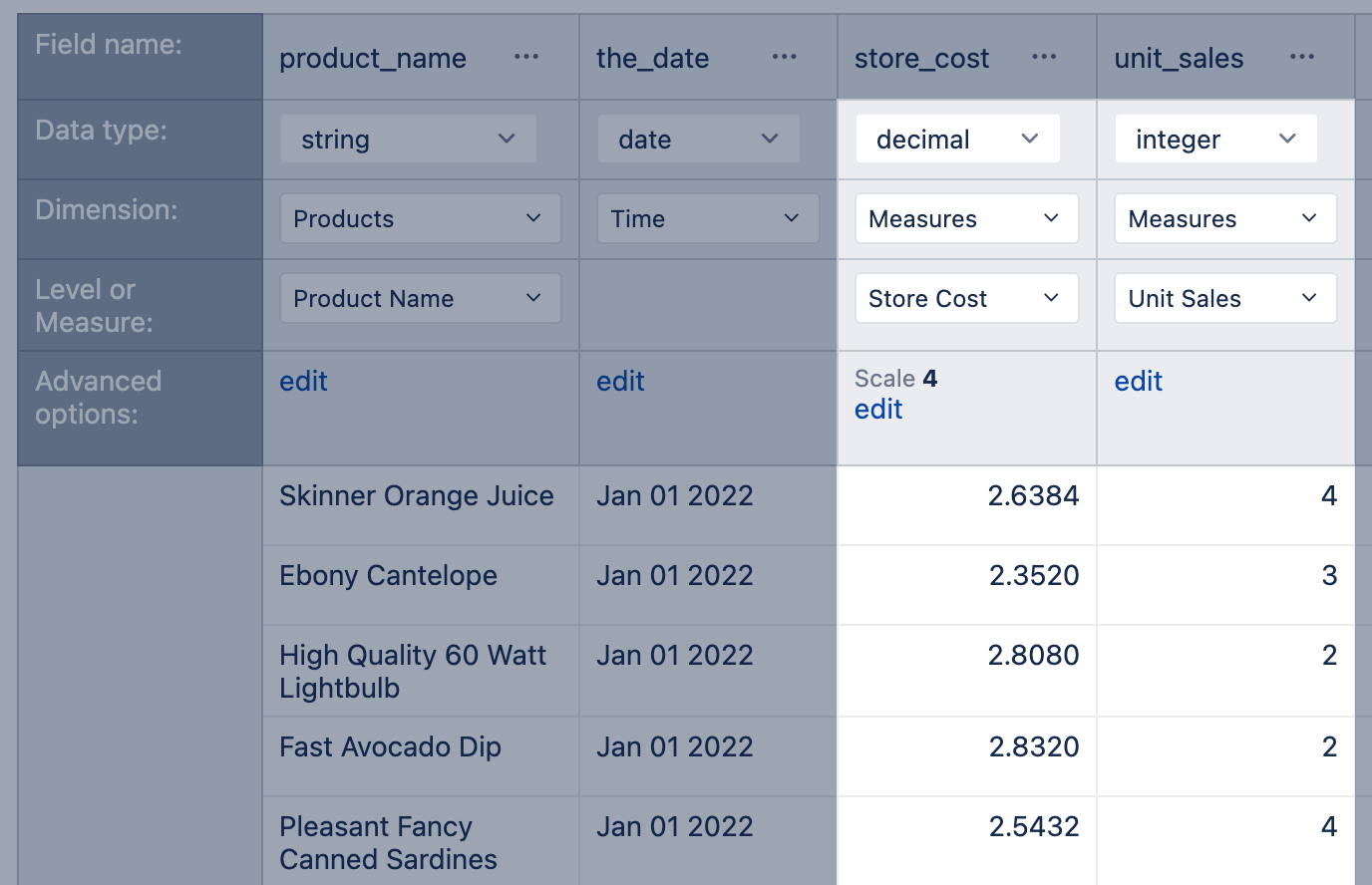 .as a decimal separator. Make sure the data source does not have a comma,as a decimal separator as this symbol is reserved; you may fix the data source or adjust source data with custom JavaScript. - For decimal values, the precision (maximum number of digits) and the scale (digits after the decimal point) are set based on data in the column. However, you can adjust both parameters by editing advanced options.
