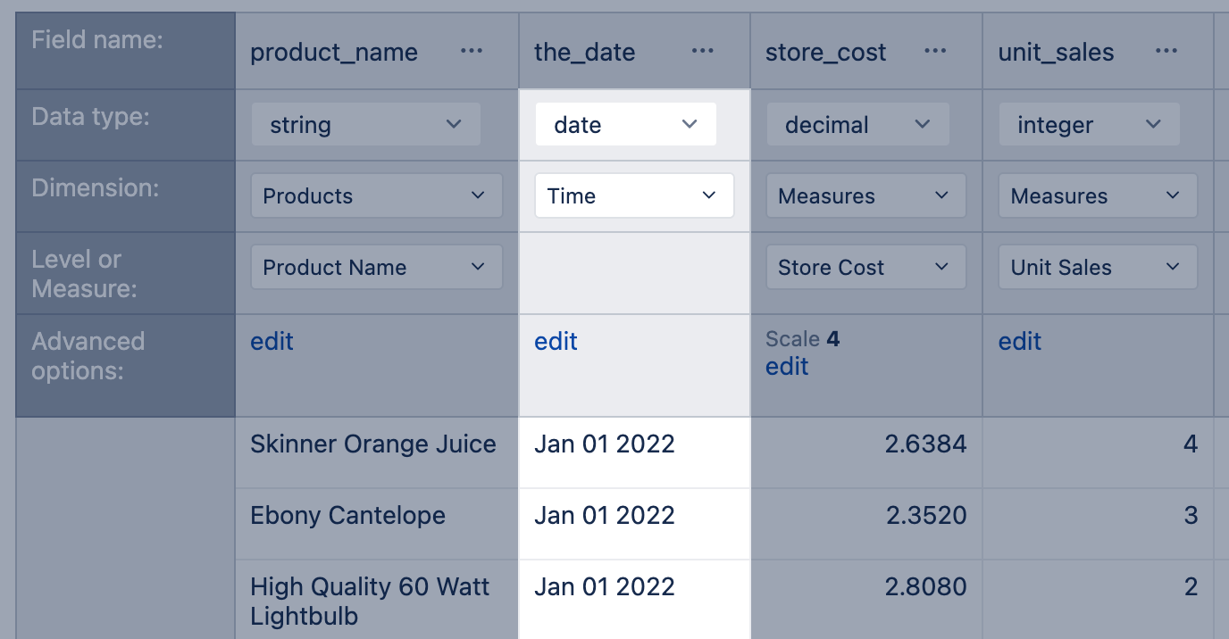 Columns holding date or datetime values are offered to import as Time dimensions by default, and flex.bi auto-magically will create a Time dimension with dates ordered in a hierarchy Year → Quarter → Month → Day and Year → Week → Day.
