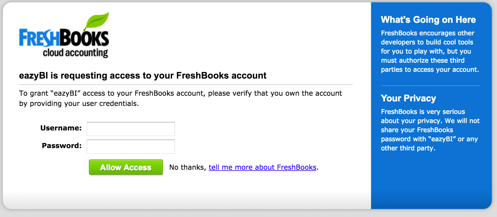 - To authorize flex.bi to import your FreshBooks account data, you will need to provide your user credentials.