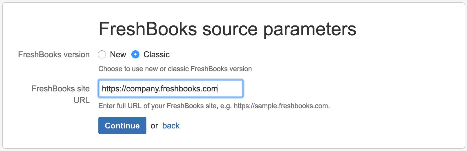 - Select the version of your FreshBooks account (“Classic”), enter your FreshBooks site URL, and click “Continue”. You will be redirected to the FreshBooks authorization page.