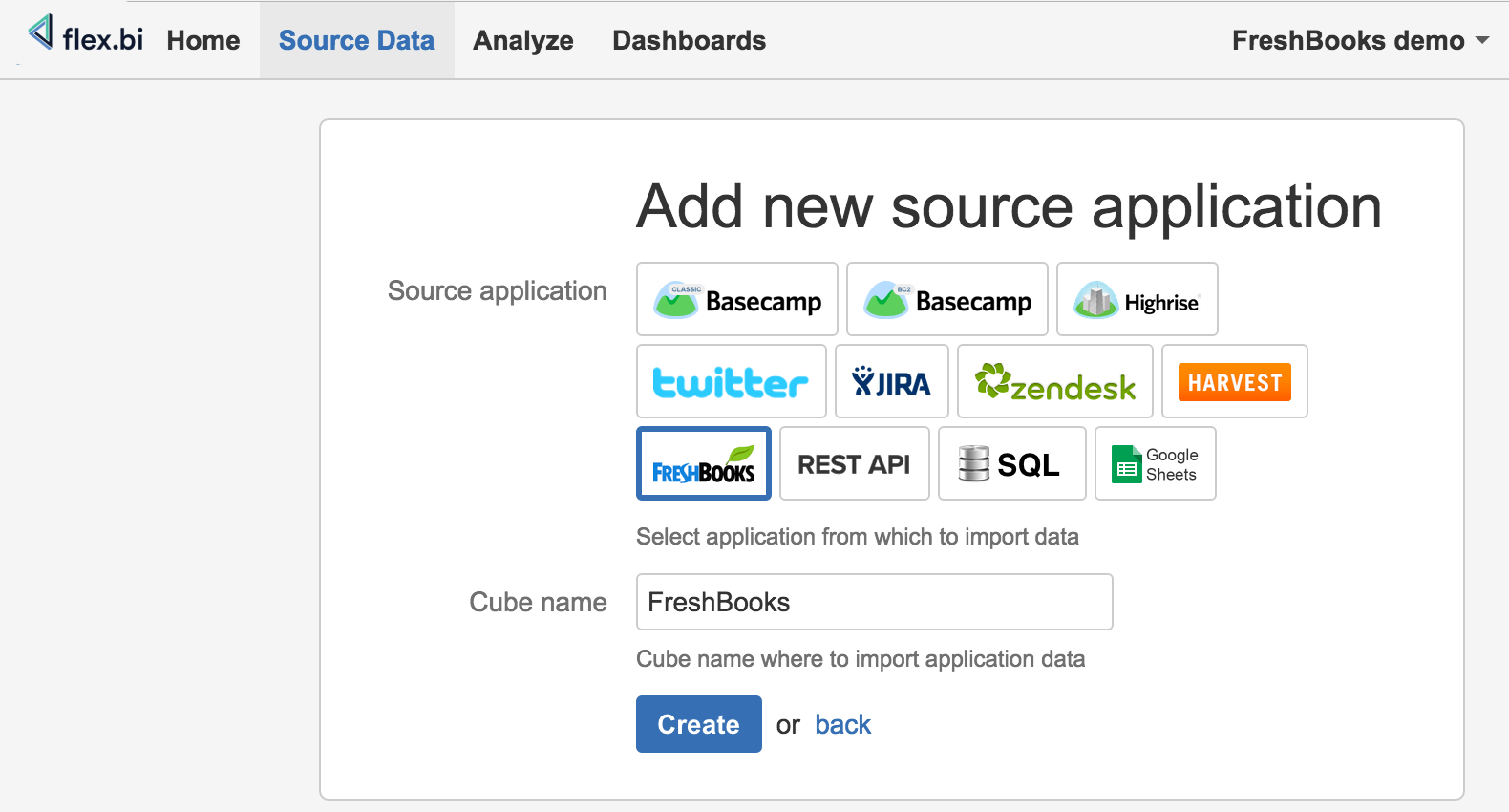 - In flex.bi open "Source Data" page, select "FreshBooks" source application, choose a name for the data cube, and click "Create".