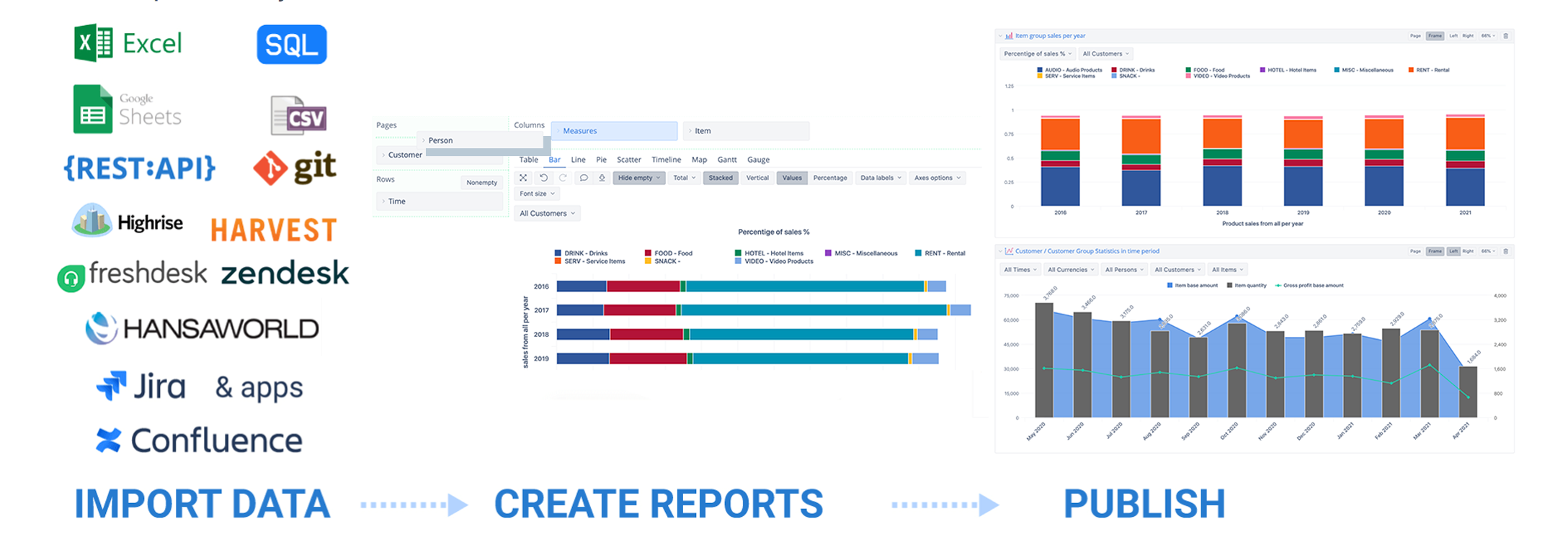 flex.bi is a powerful tool, providing easy-to-use drag-and-drop creation of custom reports, charts, and dashboard gadgets. Import your data from excel, CSV file, Google Spreadsheets or using REST API, or SQL select. Visualize, and analyze all your data using many chart types and share reports with your coworkers.