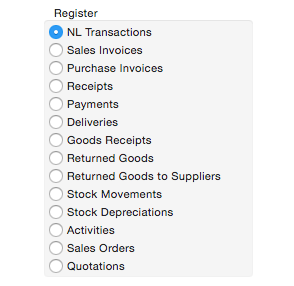 - Choose from the list of transaction registers ( choose one each time). Press Ok