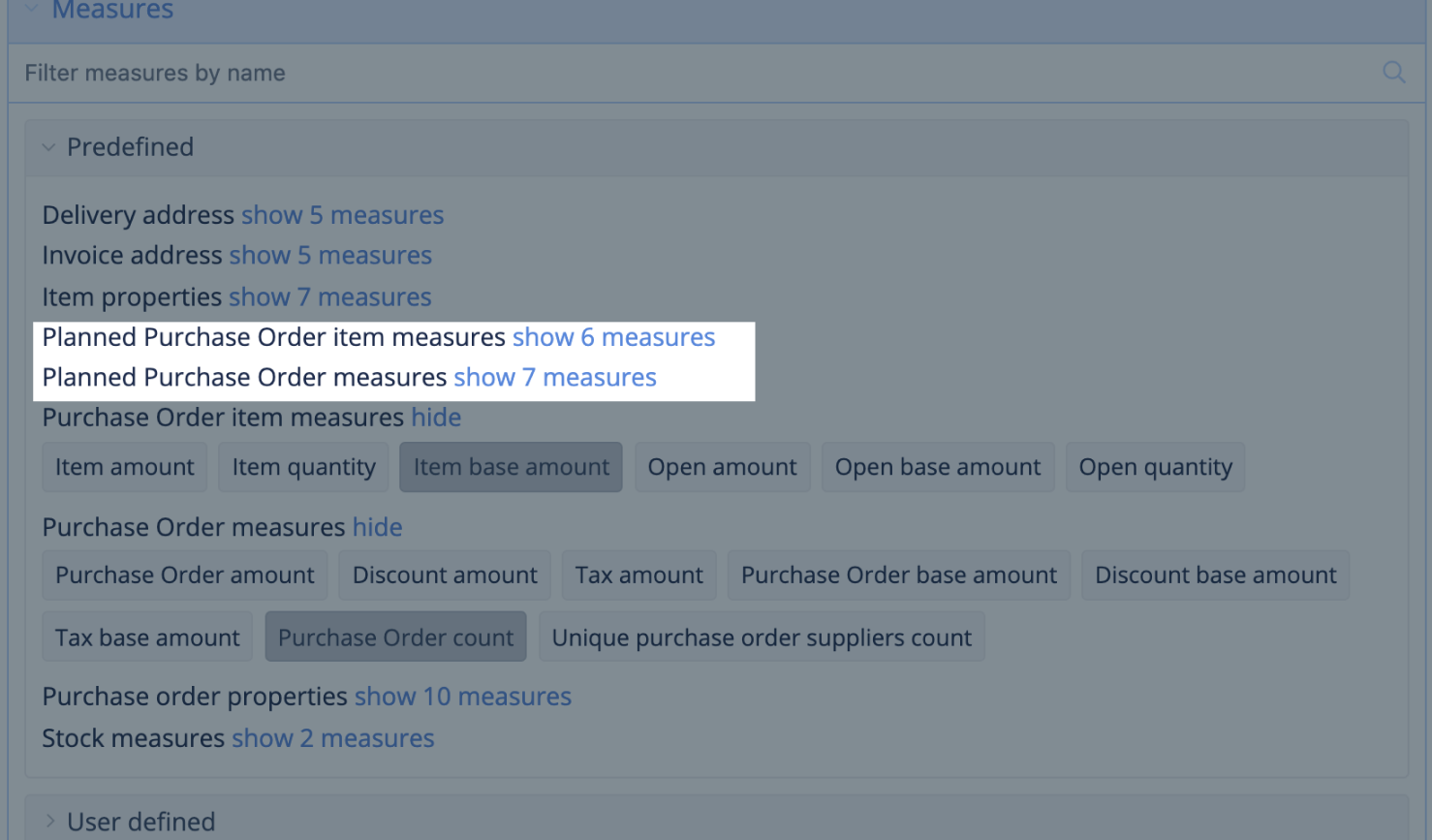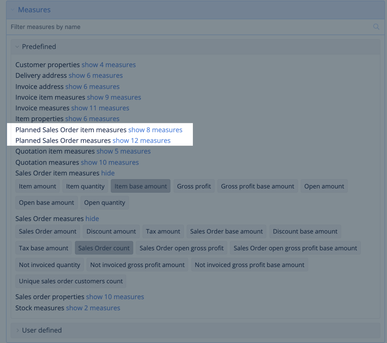 - When everything is done you will find the new measures in new sections "Planned Sales Order item measures" and "Planned Sales Order measures" for Sales order, and "Planned Purchase Order item measures" and "Planned Purchase Order measures" for Purchase Orders.