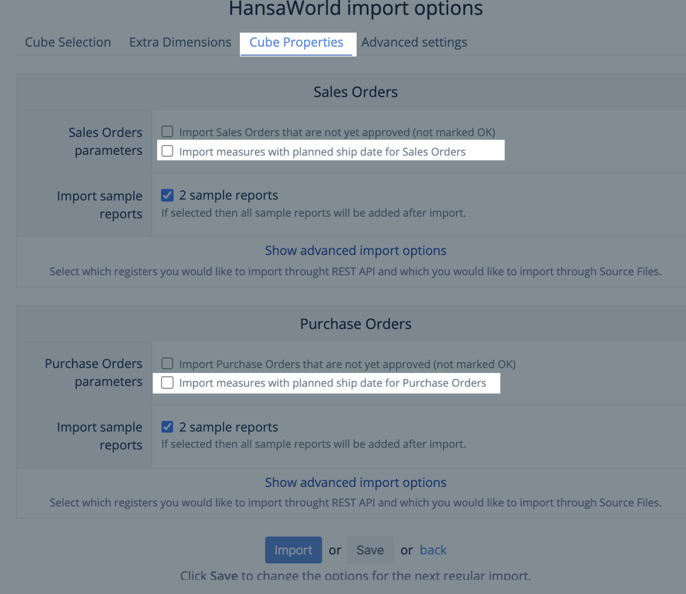 - In Cube properties section you will find checkboxes "Import measures with planned ship date for Sales Orders" and "Import measures with planned ship date for Purchase Orders".