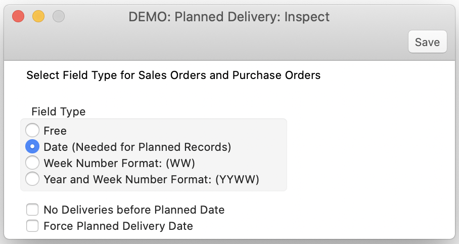 - Make sure that the Field Type is set to Date for in HansaWorld Sales Orders > Setting > Planned delivery setting: