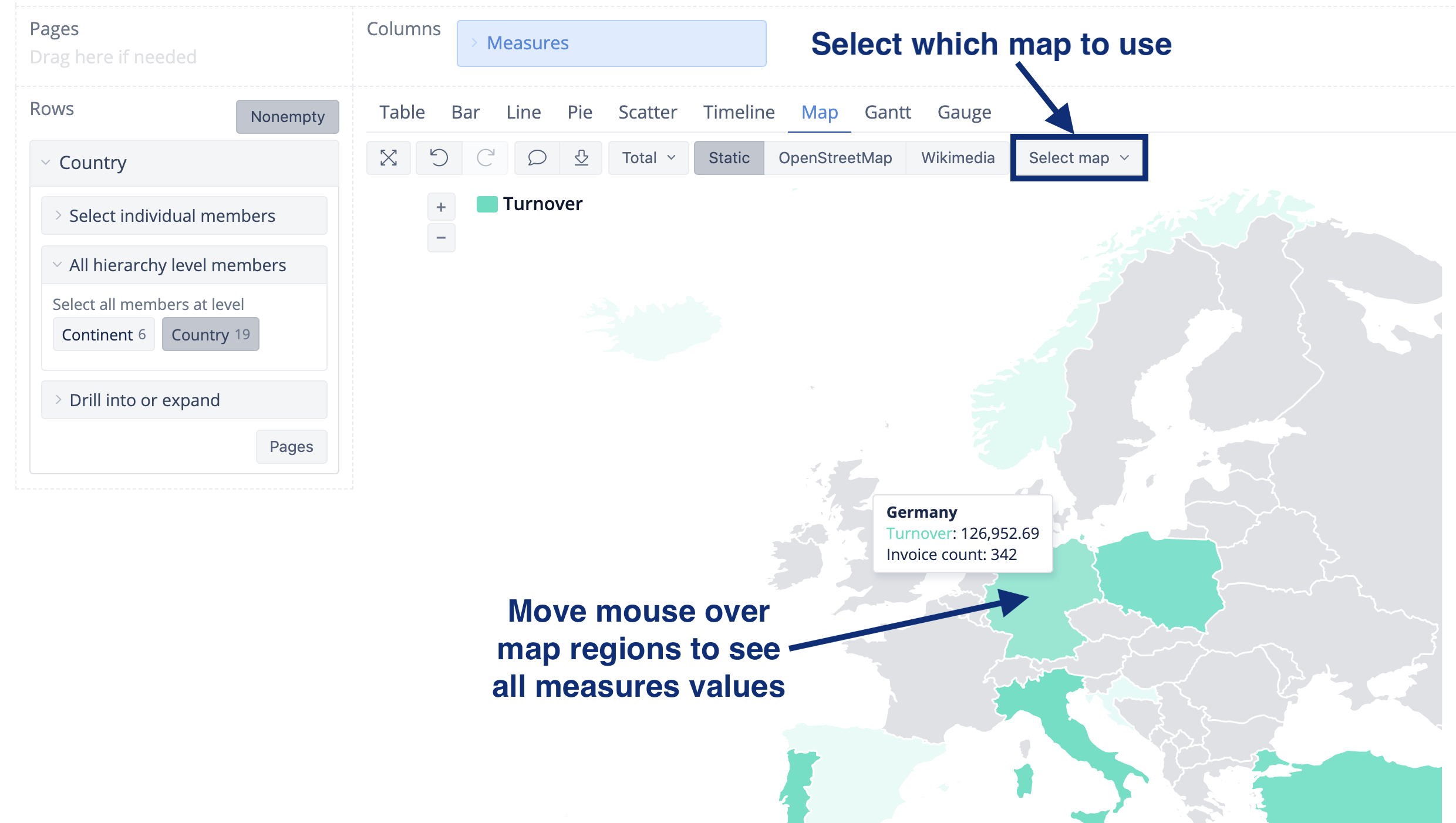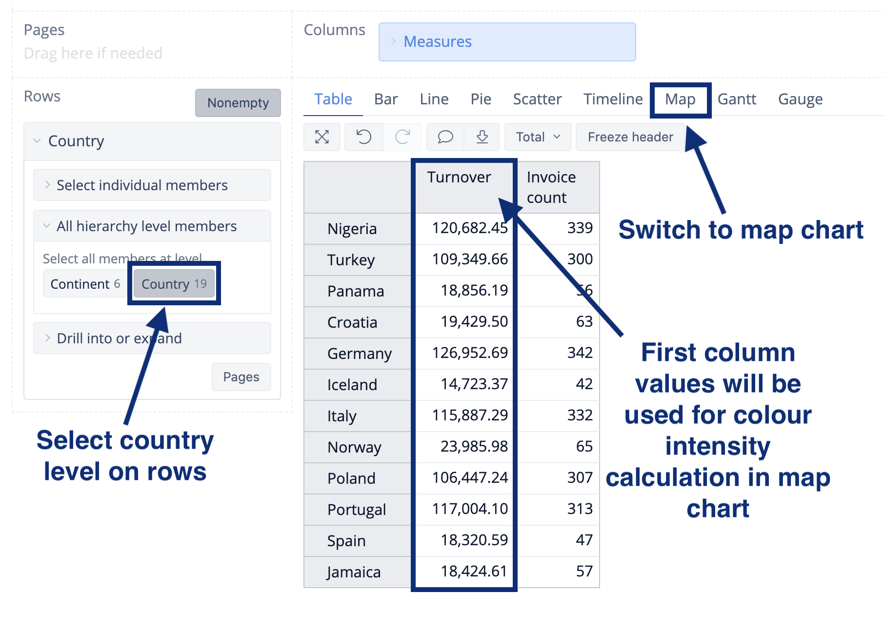 At first select Country dimension in HansaWorld Invoice cube and select country level on rows and necessary measures on columns (the first column will be used to calculate the color of the region on a map).