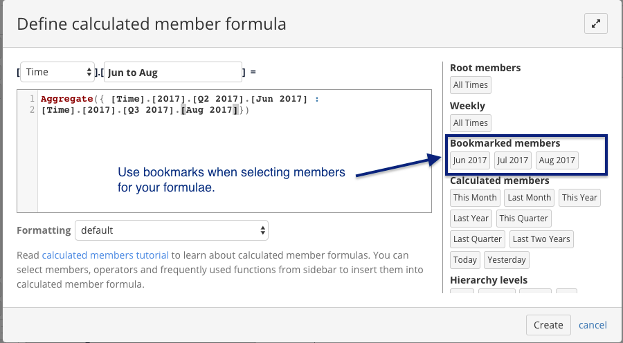 It is recommended to use bookmarks, when creating calculated members as well. Bookmarked members will appear on the side of "Define calculated member formula" window.