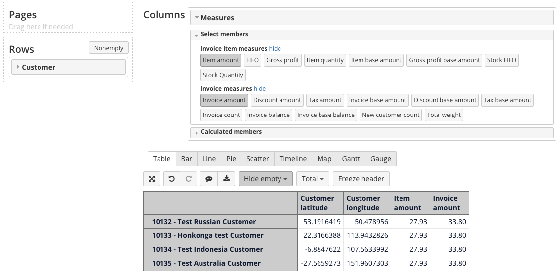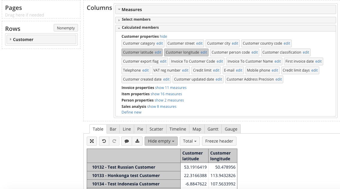 Select Customer in rows and Measures in columns. From Calculated members section select Customer latitude and Customer longitude under Customer properties. These measures should be the first selected measures in precisely this order - latitude, longitude.