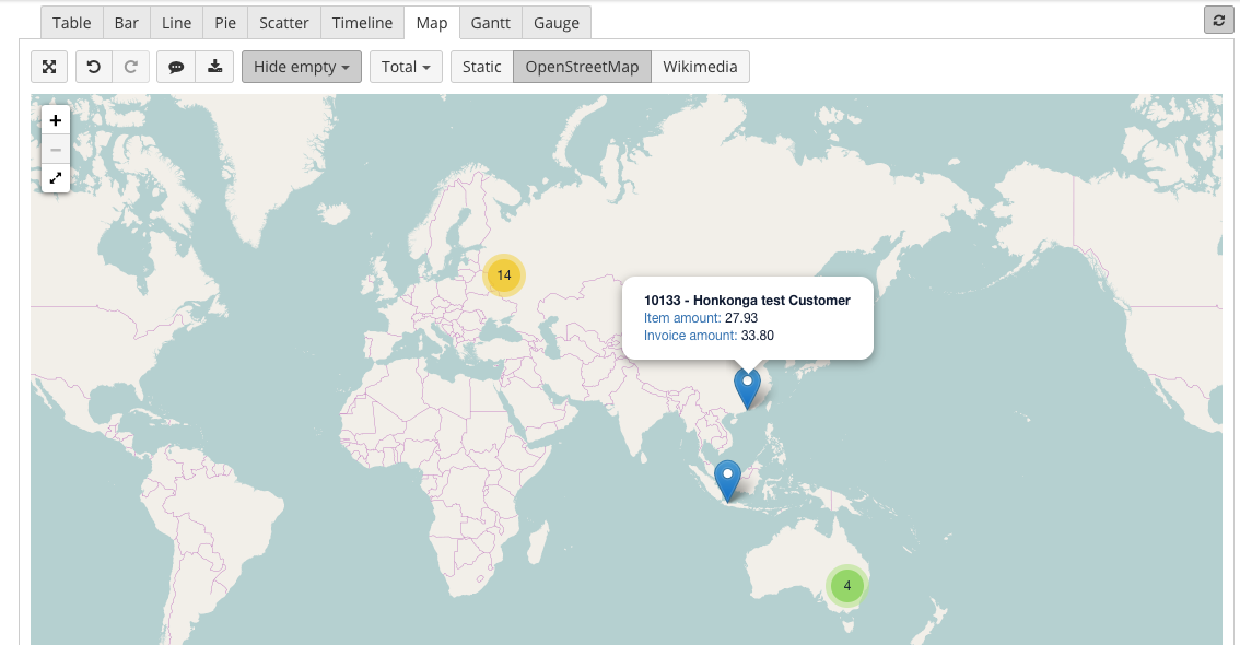 Geocoding feature is used to convert customer/supplier address data into geographical coordinates that can later be used for data visualization on a Map chart. This feature can be used in any HansaWorld data cube for which customer (CUVc) register is imported.