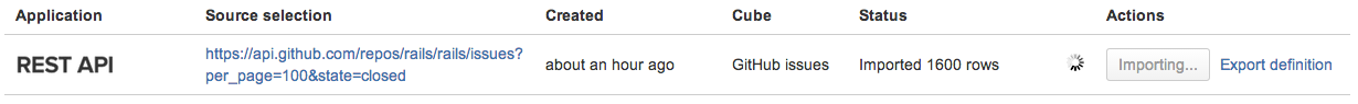 In Source data URL provide REST API URL which returns the data. In this example, we are using GitHub issues REST API to get all issues from https://github.com/rails/rails/issues. In addition, we have added parameters per_page=100 (to indicate that we want to get 100 issues per page) and state=closed to indicate that we want to get just closed issues.