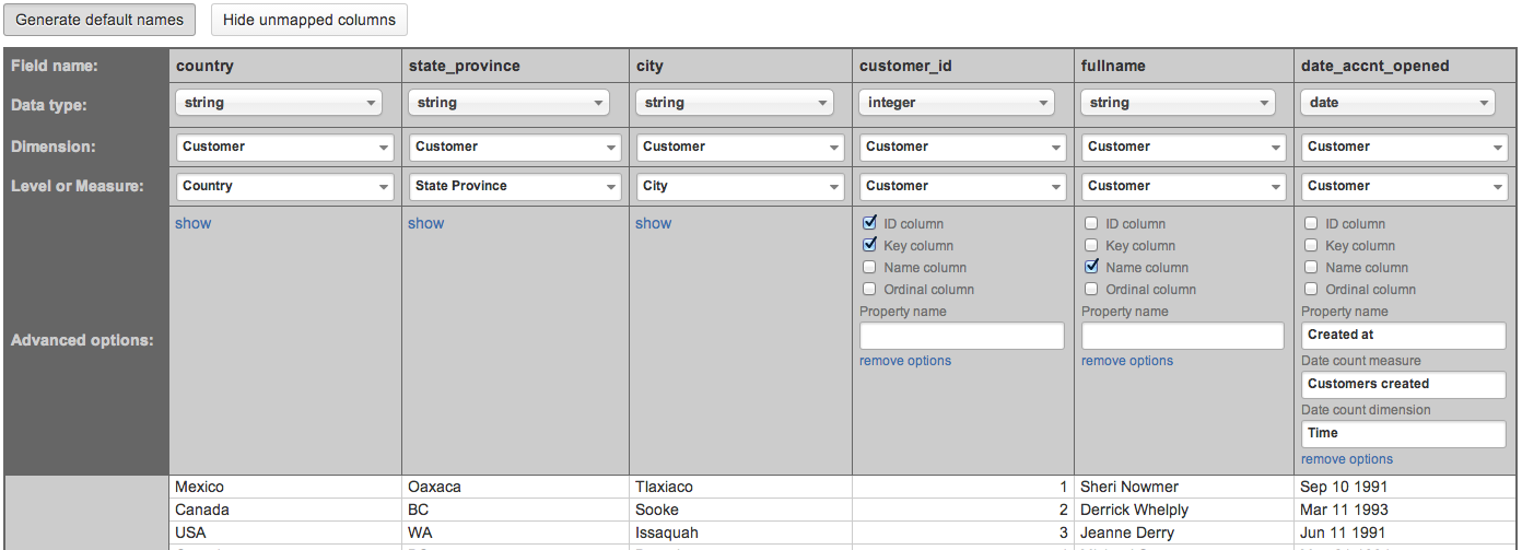 Please at first read about flex.bi cubes, dimensions and measures - you will need to understand the multi-dimensional data model to be able to map source file columns to cube dimensions and measures.