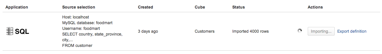If source columns mapping was saved without any validation errors, then SQL source application will be queued for background import. You will see the updated count of imported rows during the import: