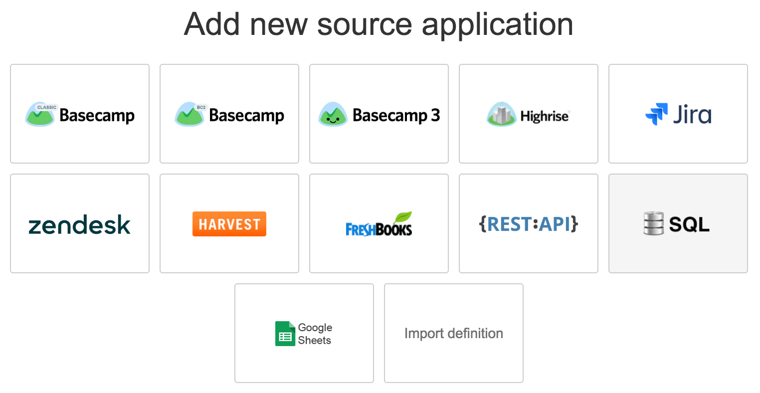 If you have already created another similar SQL data source, then you can export its definition and paste it in Import definition to create a new SQL source application with the same parameters.