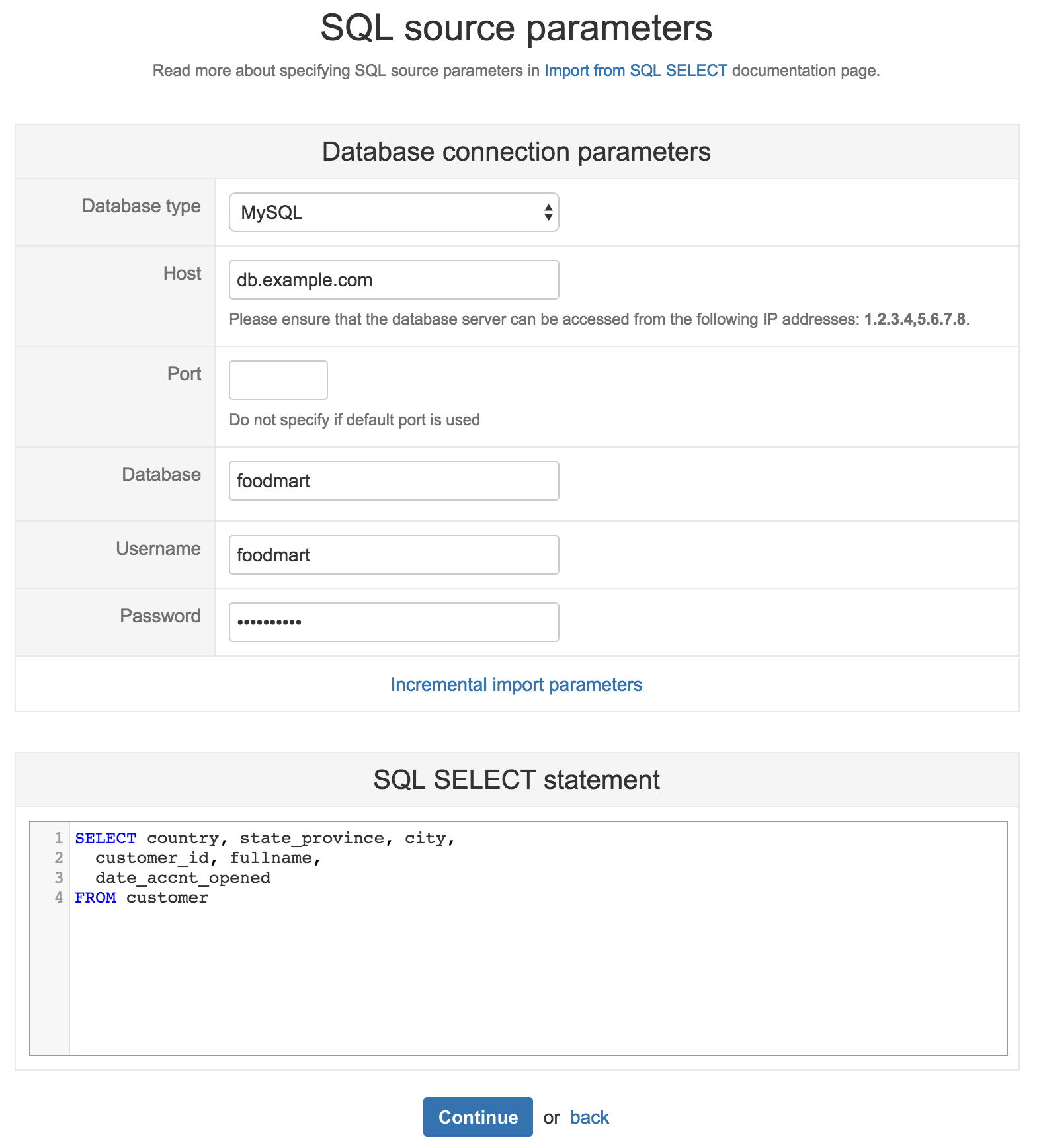 In the next step, you will need to provide SQL source parameters that will be used to retrieve the data. See example: