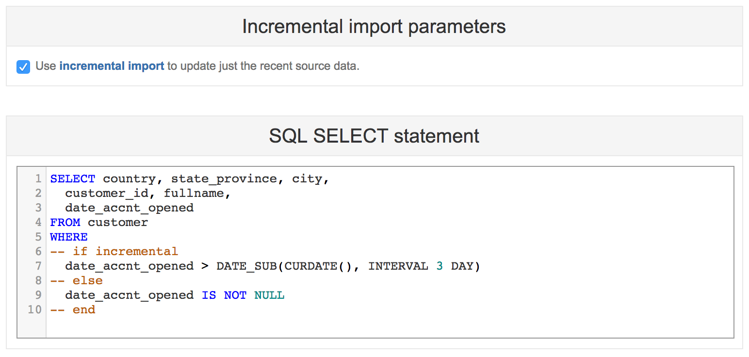 In addition, specify the incremental import WHERE conditions in the SELECT statement. Use special -- if incremental, -- else, -- end comments (as shown in the example) to specify which lines should be included only for the incremental import and which lines only for the full import. Typically you need to specify a condition that filters just recently updated rows using the corresponding date column.