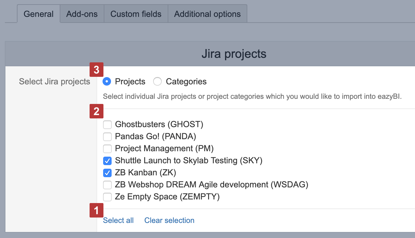 Select which Jira projects you would like to import in flex.bi. You can select all projects [1], list of chosen projects [2], or all projects with a particular category [3]. When a category for a project is changed in Jira, the project will be automatically deselected from flex.bi import, if the new category isn't selected. flex.bi will automatically detect selected Project type and will provide additional import options for Software and Service Management projects.