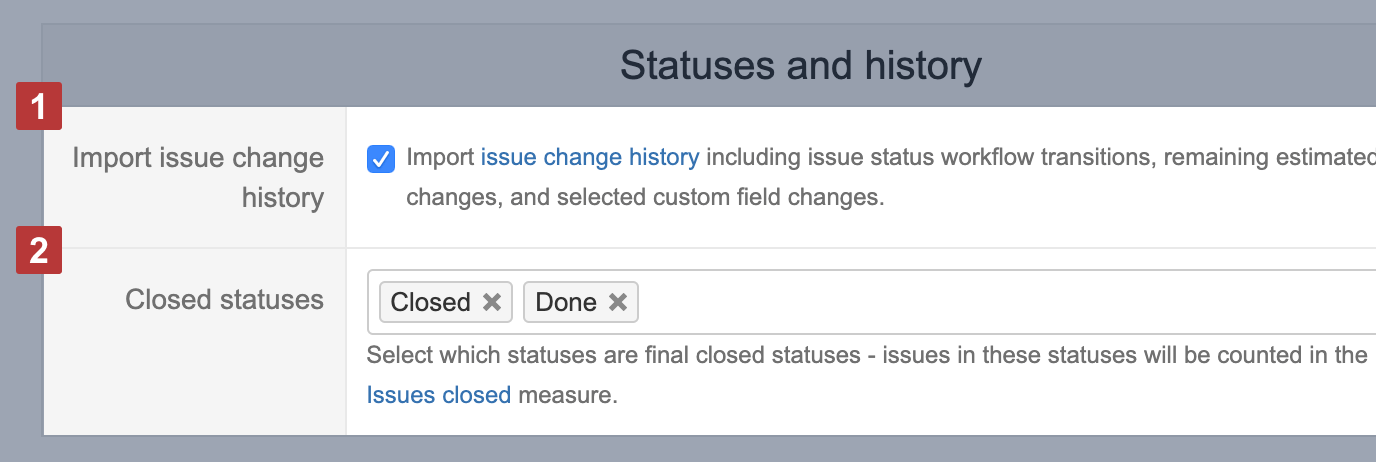 In the Statuses and history section select if you would like to import issue change history [1] as well as indicate Issues closed measure [2].