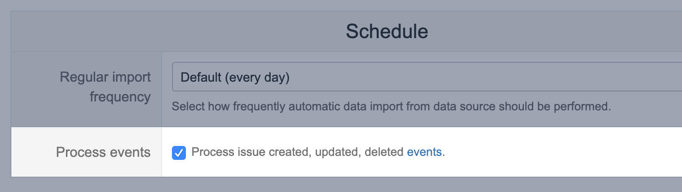 When Process events is selected, flex.bi listens to the most important Jira Cloud webhooks and updates data every hour on issue creation, resolution, updates and deletion, sprint and board changes, and logged hour events. As a result, flex.bi reports will show issues information that is not older than 1 hour even if the Regular import frequency is set to default - daily