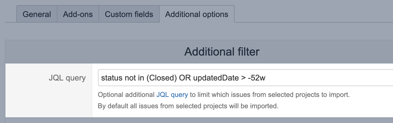 If you would like to analyze a subset of issues from selected projects, you can specify a JQL query that would limit which issues are imported.