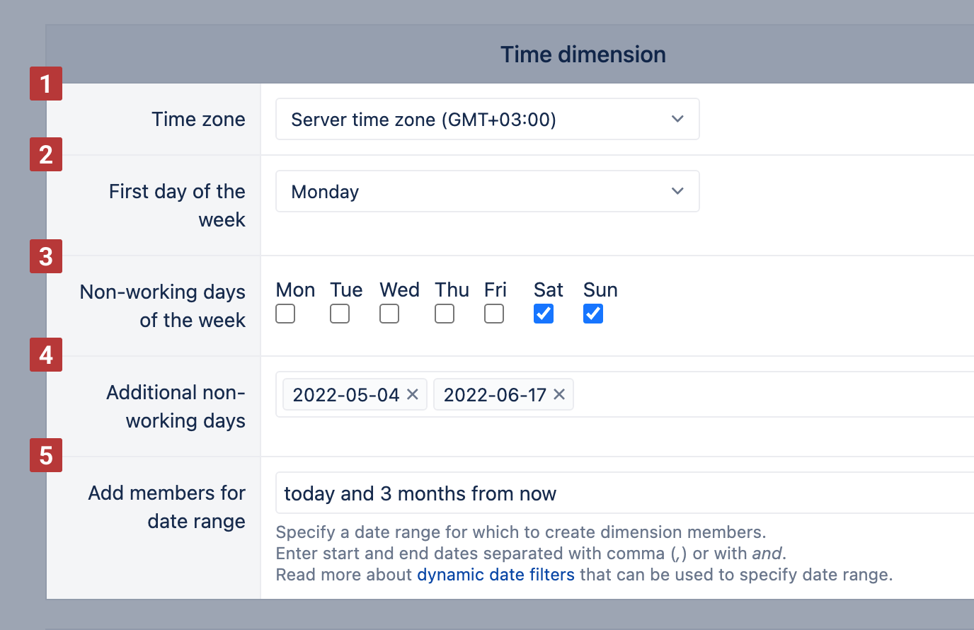 You can specify the time zone [1], the first day of the week [2] and non-working days [3] [4] of the Time dimension.
