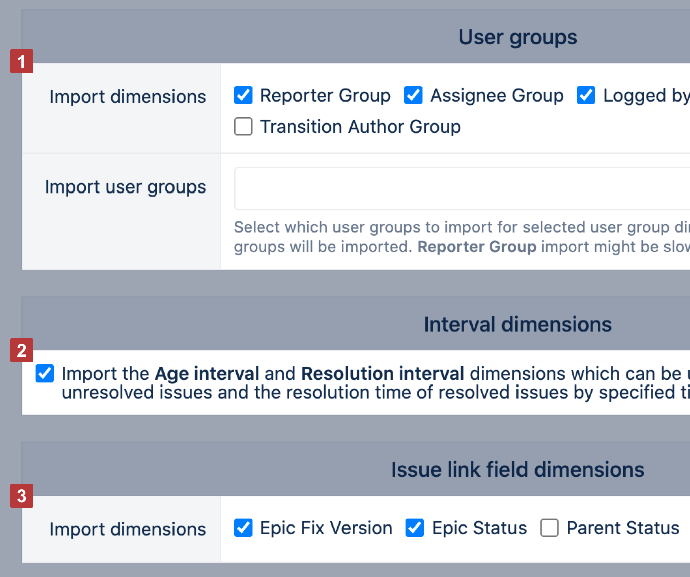 You can import user groups for Assignee, Reporter, Logged by, or Transition author and specify set of groups you would like to use in your reports [1]. Select the option to import Age and Resolution Intervals dimensions [2] if you would like to create reports by unresolved issue age intervals or by Issue resolution intervals.
