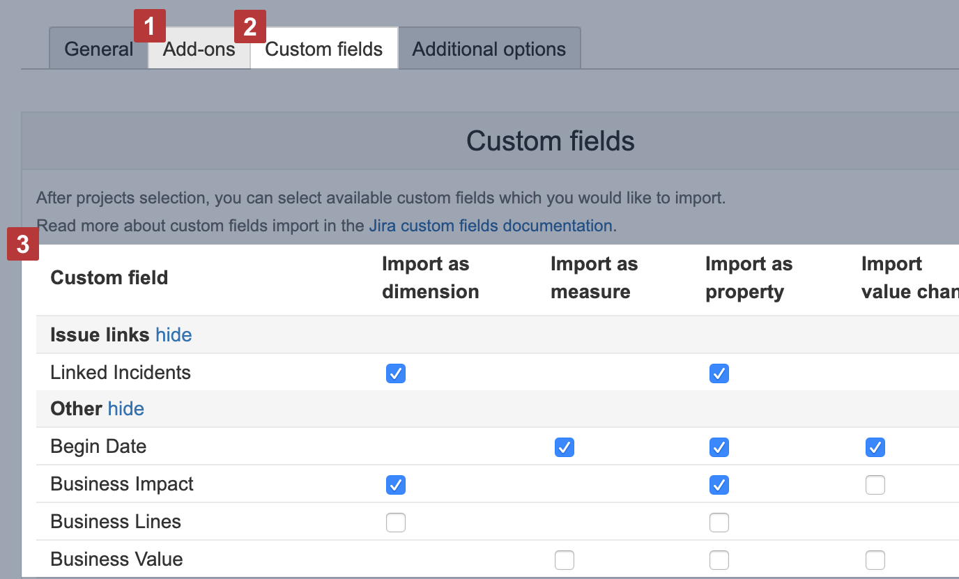 If you would like to import Jira custom fields then go to tab Custom fields [2] [3] or tab Add-ons [1] to import custom fields specific to Jira apps flex.bi has integration with [1]. And select custom fields you would like to import. And select either individual checkboxes (Import as a dimension, Import as a measure, Import as a property, or Import value changes) or click on a custom field name to select all available checkboxes for this custom field. Available import options depend on the custom field type or advanced settings for the custom field (if applied).