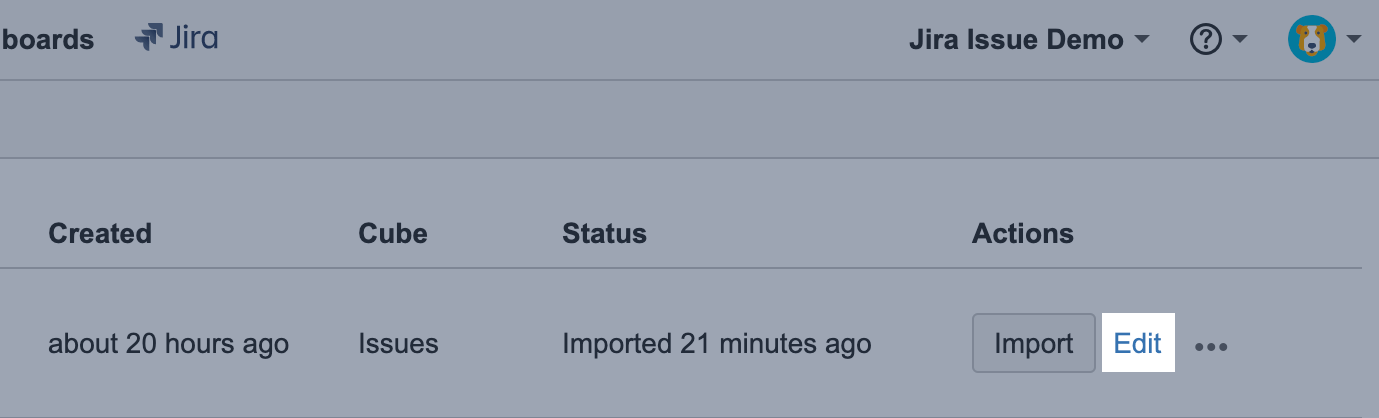 In the Source Data tab, you will see the current status of the Jira import background job, as well as additional information - when the data cube was created, projects imported in this cube, imported projects, and a user whose credentials are used to authorize Jira for data import.