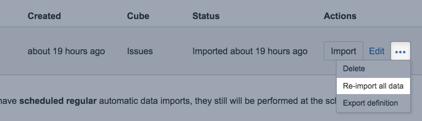 In some cases, you may want to reimport just data (measures). During this import, Issues are not being deleted and reports will not appear empty until the import is completed.