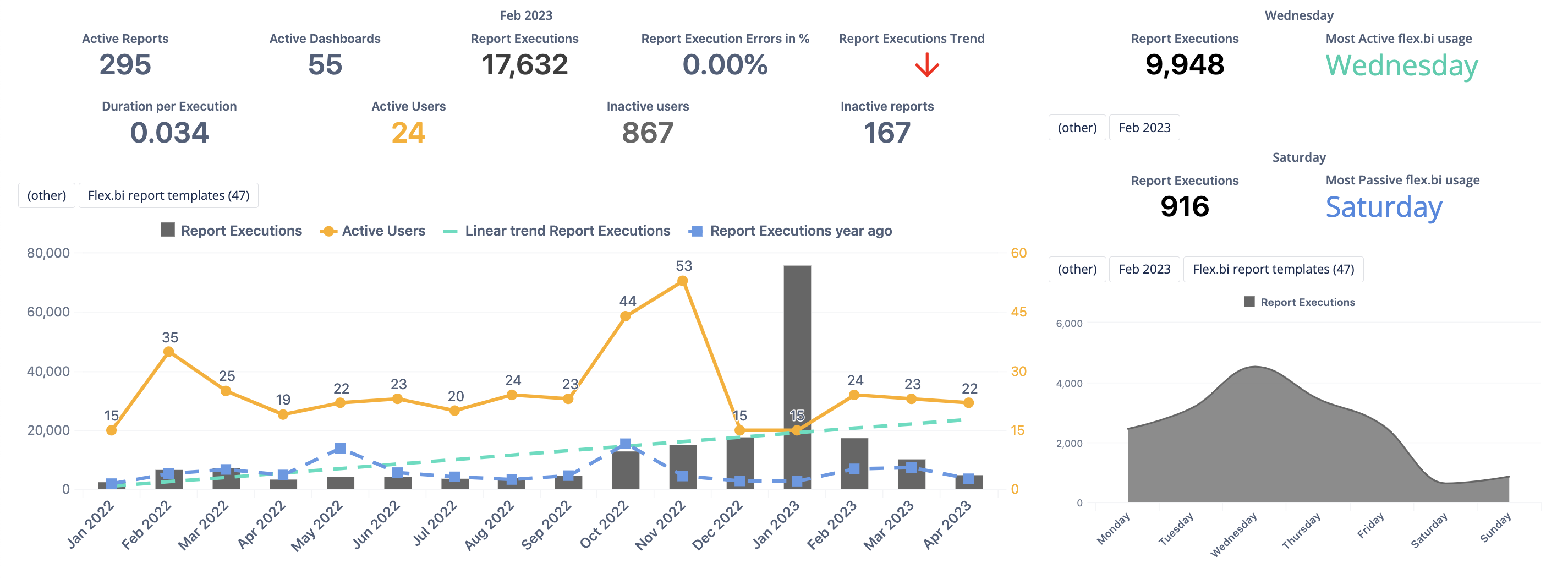 Usage statistics is an optional flex.bi feature that can be used to analyze flex.bi usage using flex.bi. If enabled then flex.bi report execution requests and source data imports are stored in a special usage statistics flex.bi account and usage statistics reports and dashboards can be created to analyze flex.bi usage. A set of default reports and a dashboard of these reports will be created in this account. You can use these reports to see the overview of daily usage, see top executed reports and dashboards, reports with errors or slow reports.