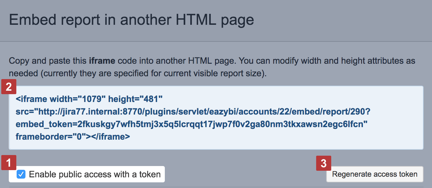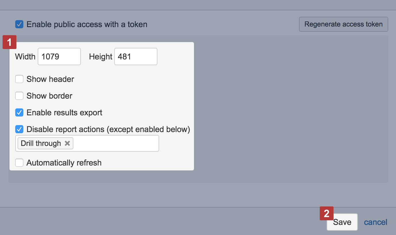 Then select Enable public access with a token [1]. An additional parameter embed_token is added to the iframe URL [2]. This token is unique for this report (or dashboard) and will be used to authenticate that anonymous users can see report results for this specific report. Note the report data won't be visible to users without this public access token.