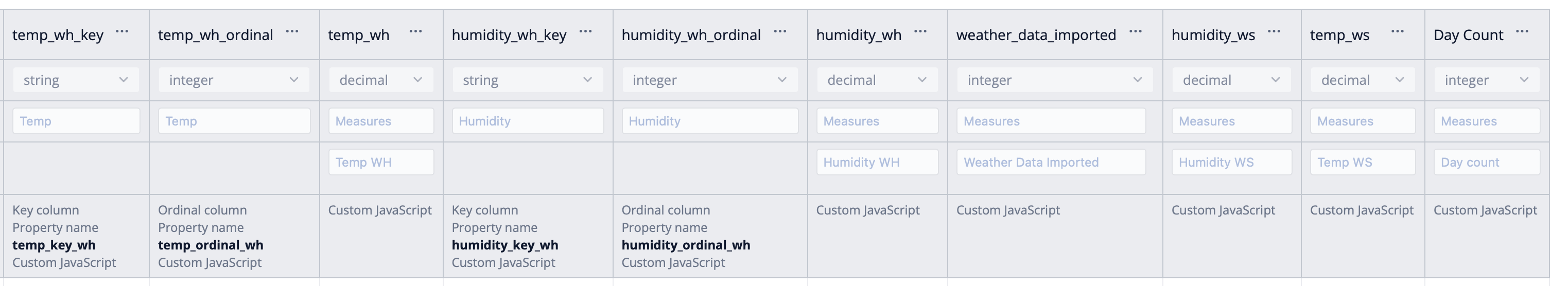 w_d_imported - (data type: integer) - this will be used for marking the lines that have already been processed.For other column naming you should use the names of the fields returned my the weather service, for instance, temp, humidity, etc. The full list can be found here: https://www.visualcrossing.com/resources/documentation/weather-api/timeline-weather-api/ under the heading “Response weather data elements”.
